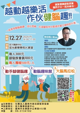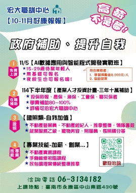 在資訊更新迅速,新知湧現的社會中,如何即時消化接踵而來的資訊,讓觀念與能力與時並進,是現代人共同面臨的難題。宏大職訓中心長期舉辦「菁英講座」及「專題講座」,邀請不動產、人文、數位、環保、音樂、NPO…等領域的專家達人,與民眾分享他們的專業知識與趨勢觀察,透過各領域的達人專家增廣見聞、拓展視野,讓您的生活不再平凡、多采多姿!
