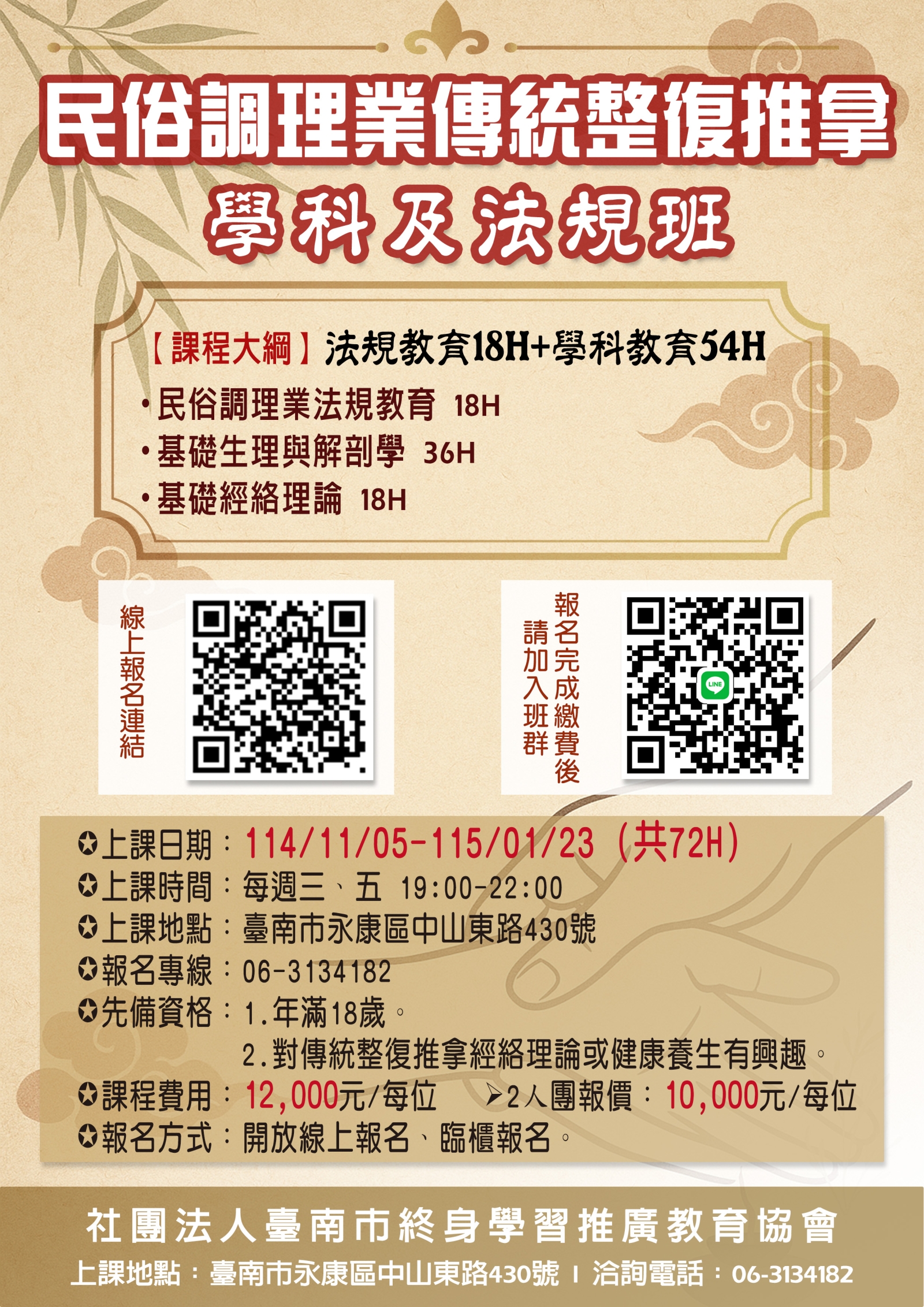 114/11/5-115/1/23 民俗調理業傳統整復推拿 學科及法規班