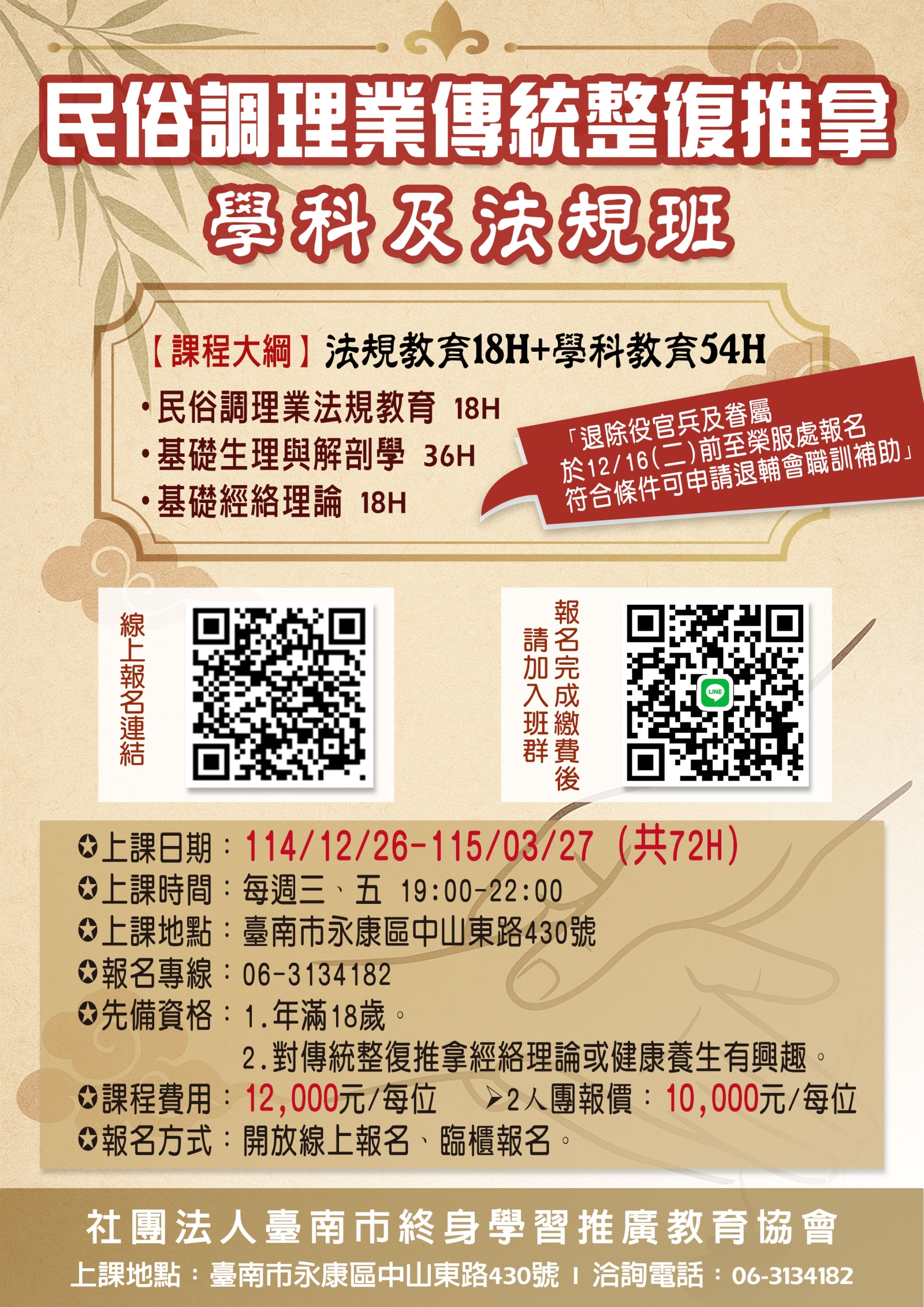 114/12/26-115/3/27民俗調理業傳統整復推拿 學科及法規班