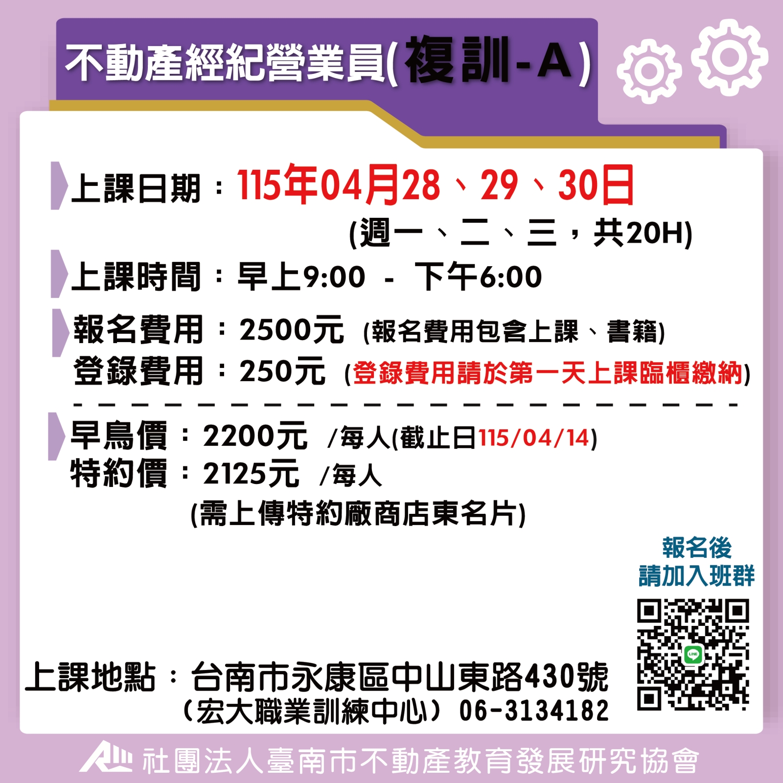 不動產經紀營業員-複訓 (複訓) A班-115(上) 4/28-4/30 不動產經紀營業員(複訓) 我要報名 報名費用 2500 剩餘可報名人數 48 **請詳讀【課程介紹】與【報名須知】** **報名資料:填寫不實、不完整者,將不予錄取** **報名後,請務必加入班群** 回列表頁 我要報名