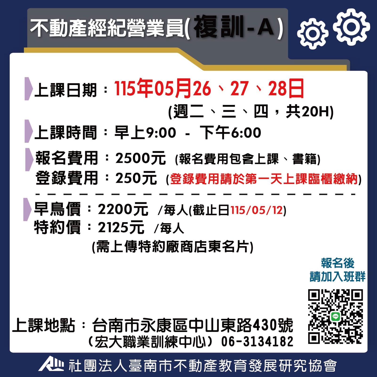 不動產經紀營業員-複訓 (複訓) A班-115(上) 5/26-5/28 不動產經紀營業員(複訓) 我要報名 報名費用 2500 剩餘可報名人數 48 **請詳讀【課程介紹】與【報名須知】** **報名資料:填寫不實、不完整者,將不予錄取** **報名後,請務必加入班群** 回列表頁 我要報名