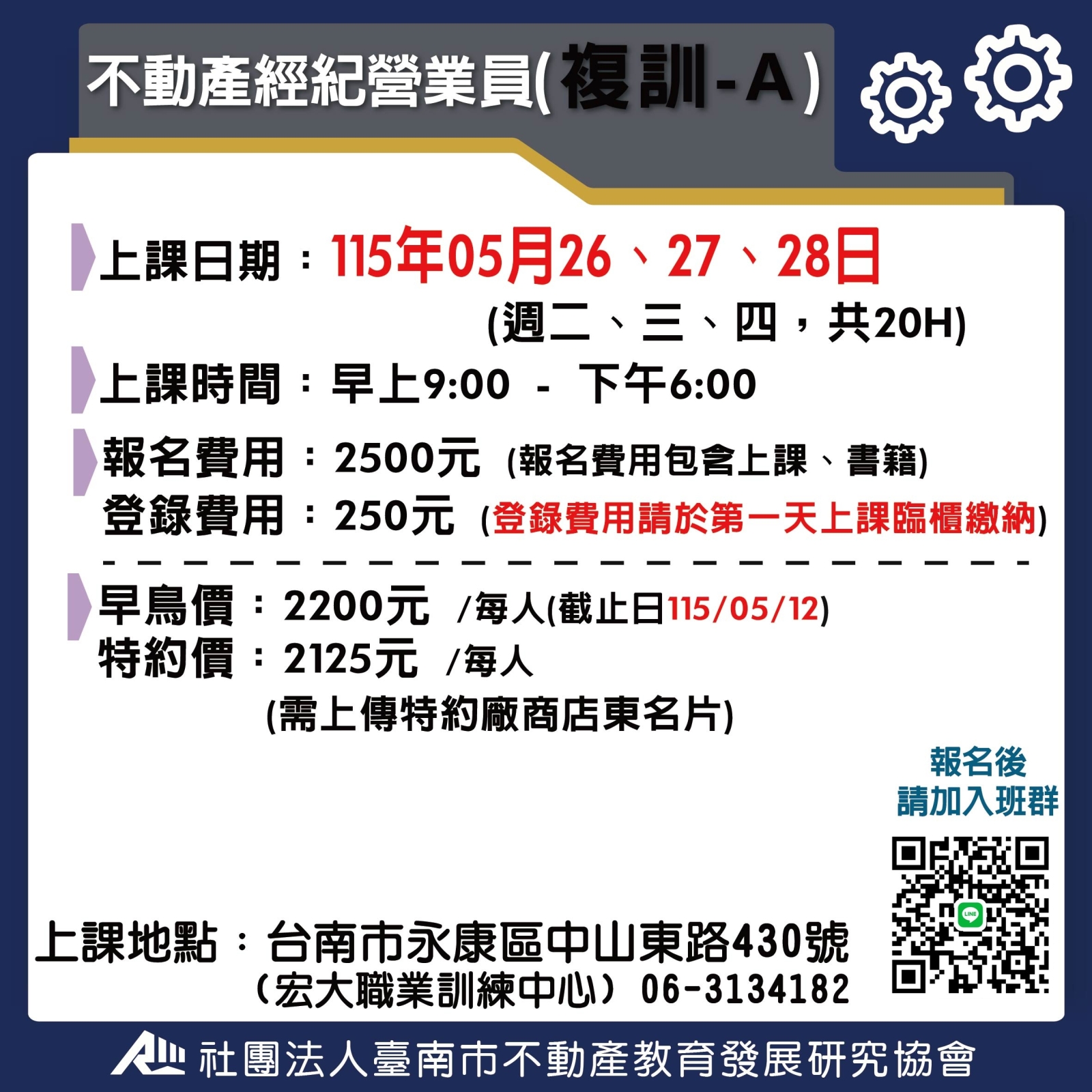 不動產經紀營業員-複訓 (複訓) A班-115(上) 5/26-5/28 不動產經紀營業員(複訓) 我要報名 報名費用 2500 剩餘可報名人數 35 **請詳讀【課程介紹】與【報名須知】** **報名資料:填寫不實、不完整者,將不予錄取** **報名後,請務必加入班群** 回列表頁 我要報名