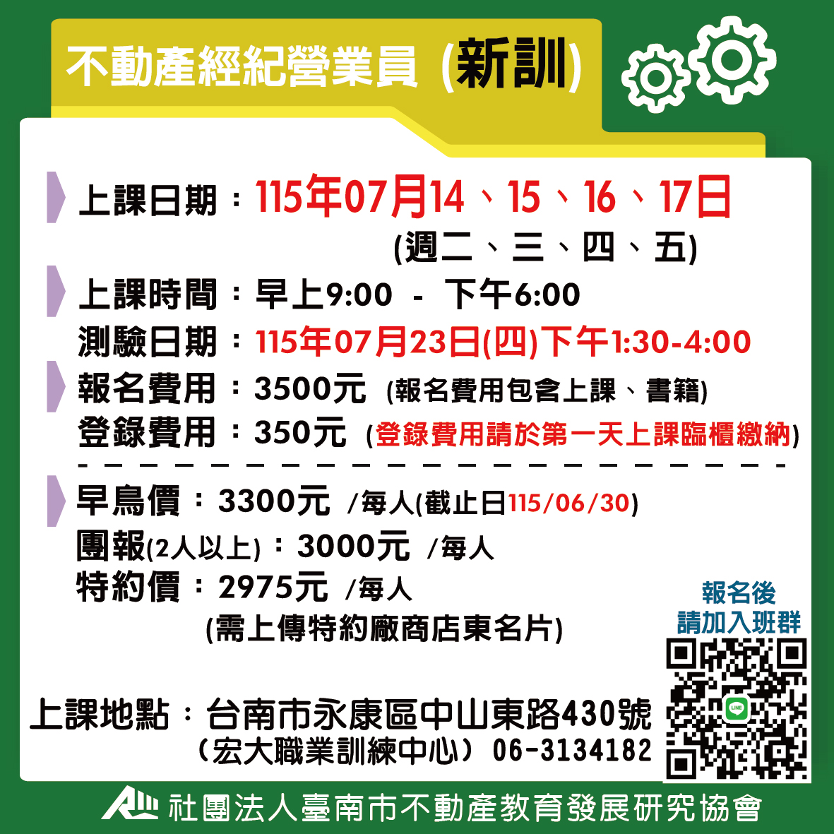 不動產經紀營業員-新訓 (首次) 115(下) 7/14-7/17 不動產經紀營業員(新訓) 我要報名 報名費用 3500 團報費用 3000 剩餘可報名人數 48 **請詳讀【課程介紹】與【報名須知】** **報名資料:填寫不實、不完整者,將不予錄取** **報名後,請務必加入班群** 回列表頁 我要報名