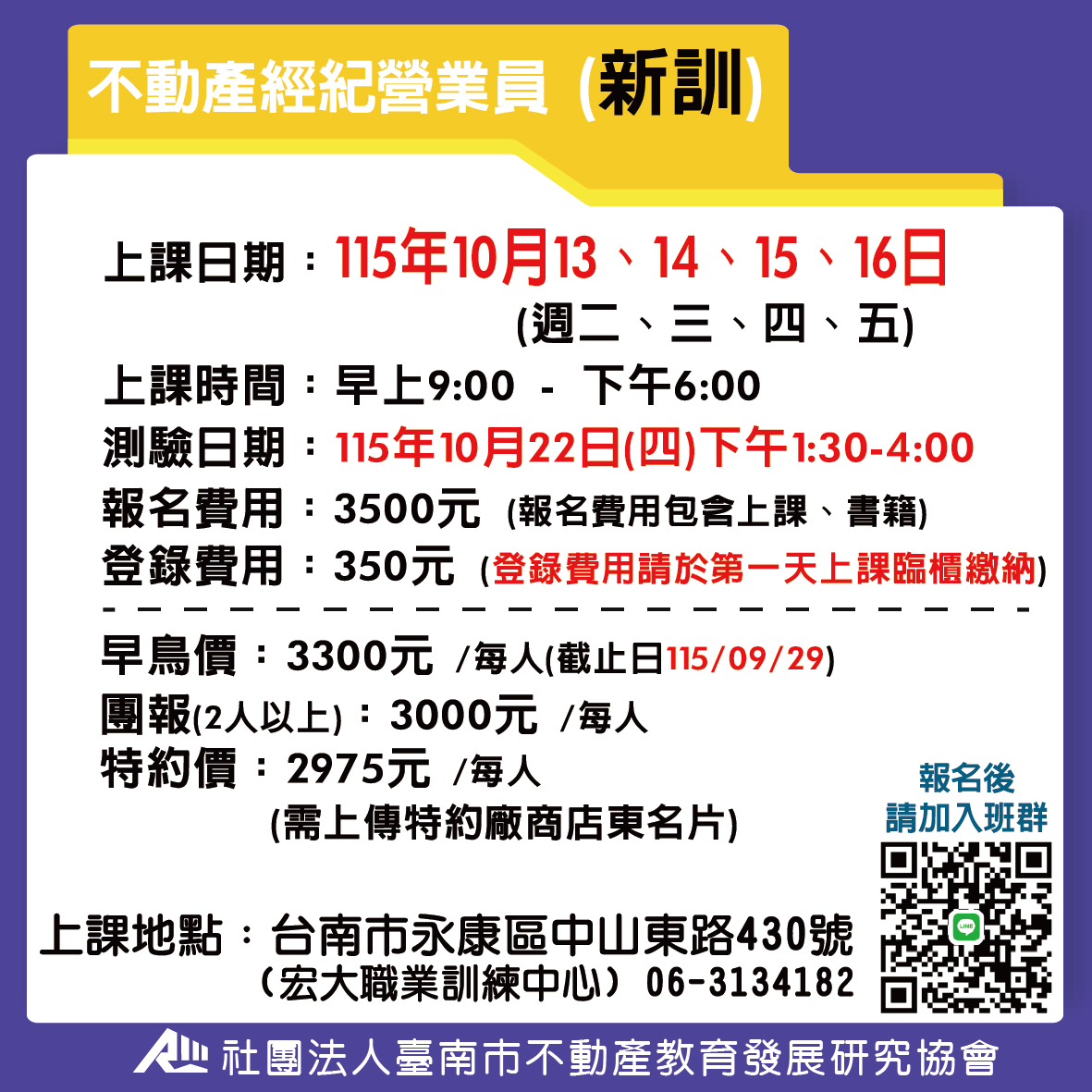 不動產經紀營業員-新訓 (首次) 115(下) 10/13-10/15 不動產經紀營業員(新訓) 我要報名 報名費用 3500 團報費用 3000 剩餘可報名人數 48 **請詳讀【課程介紹】與【報名須知】** **報名資料:填寫不實、不完整者,將不予錄取** **報名後,請務必加入班群** 回列表頁 我要報名