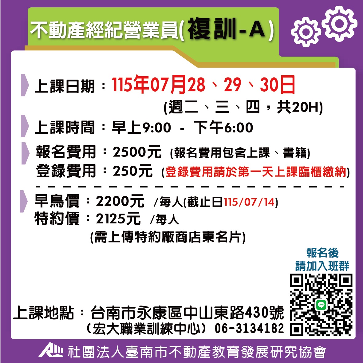 不動產經紀營業員-複訓 (複訓) A班-115(下) 7/28-7/30 不動產經紀營業員(複訓) 我要報名 報名費用 2500 剩餘可報名人數 46 **請詳讀【課程介紹】與【報名須知】** **報名資料:填寫不實、不完整者,將不予錄取** **報名後,請務必加入班群** 回列表頁 我要報名