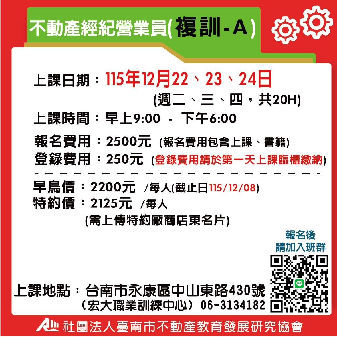 不動產經紀營業員-複訓 (複訓) A班-115(下) 12/22-12/24 不動產經紀營業員(複訓) 我要報名 報名費用 2500 剩餘可報名人數 48 **請詳讀【課程介紹】與【報名須知】** **報名資料:填寫不實、不完整者,將不予錄取** **報名後,請務必加入班群** 回列表頁 我要報名