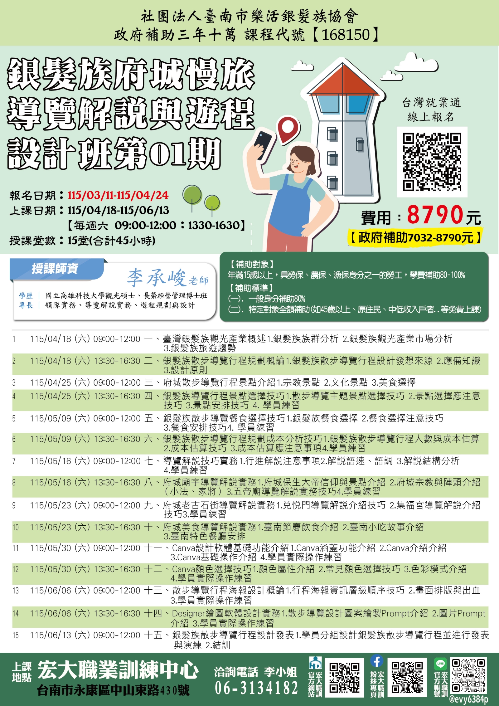 【168150】115/4/18-115/6/13銀髮族府城慢旅導覽解說與遊程設計班第01期