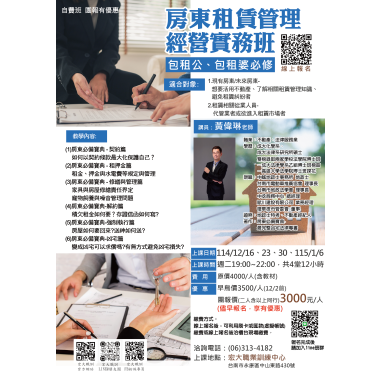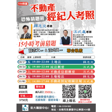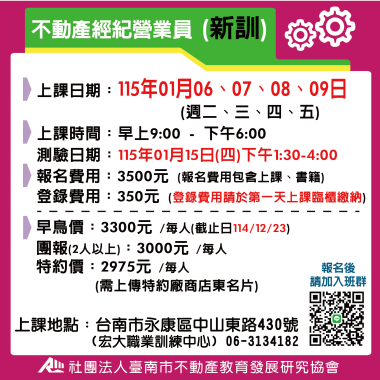 民俗調理業傳統整復推拿 114/11/5-115/1/23 民俗調理業傳統整復推拿 學科及法規班 【技術士技能檢定】 民俗調理業傳統整復推拿職類專業課程 課程介紹 我要報名 自費課程 11/17-11/21 手機維修 初階實作班 課程介紹 我要報名 產業人才投資計畫課程總表 114年度下半年產業人才投資計畫之課程總覽 政府補助 三年十萬 課程介紹 我要報名 不動產類 10/17、10/24、10/25、10/31、11/01 不動產經紀人考照-恐怖猜題班 課程介紹 我要報名 不動產類 114/10/28 - 不動產特殊規定解析班 【不動產實務課程】【專業講師】 課程介紹 我要報名 不動產類 114/10/29 不動產房屋投資、改建裝修技術工程 【不動產實務課程】【專業講師】 課程介紹 我要報名 不動產實務 【165219】114/9/18 時效取得地上權實例解析班第01期 政府補助 三年十萬 課程介紹 我要報名 不動產經紀人 10/17、10/24、10/25、10/31、11/01 不動產經紀人考照-恐怖猜題班 課程介紹 我要報名 不動產經紀人 114/11/11-11/14 不動產經紀人複訓 課程介紹 我要報名 人力資源與管理 【164809】114/10/14 ESG與碳盤查查證人員訓練班第01期 政府補助 三年十萬 課程介紹 我要報名 電腦數位科技 【165105】114/10/07 AI品牌視覺設計與應用實務班第01期 政府補助 三年十萬 課程介紹 我要報名 電腦數位科技 【165204】114/10/20 AI影音創作入門班第01期 政府補助 三年十萬 課程介紹 我要報名 職場語言 【165060】114/10/20 手語多元技能基礎班第01期 政府補助 三年十萬 課程介紹 我要報名 健康運動管理 【164995】114/10/28 樂齡運動指導員培力實務班第03期 政府補助 三年十萬 課程介紹 我要報名 人力資源與管理 【164810】114/11/2 ESG與產品碳足跡查證人員訓練班第01期 政府補助 三年十萬 課程介紹 我要報名 不動產實務 【165220】114/11/3 非都市土地變更使用實務解析班第01期 政府補助 三年十萬 課程介紹 我要報名 電腦數位科技 【164944】114/11/05 AI工作流應用實踐班第02期 政府補助 三年十萬 課程介紹 我要報名 電腦數位科技 114/11/12 AI短影片行銷班第01期 政府補助 三年十萬 課程介紹 我要報名 觀光休閒旅遊 【165183】114/11/11 觀光導遊領隊人員實務班第02期 政府補助 三年十萬 課程介紹 我要報名 製造業&服務業 短影片行銷班 1.滿10人開課 2.報名前請詳看資訊說明 課程介紹 我要報名 不動產證照補助 114(下)年度 地政士考照班 政府補助 三年十萬 【按下課程介紹】 依照各科的報名區間,連結至台灣就業通報名,謝謝!! 課程介紹 我要報名 地政士考照 114(下)年度 地政士考照班 政府補助 三年十萬 【按下課程介紹】 依照各科的報名區間,連結至台灣就業通報名,謝謝!! 課程介紹 我要報名 製造業&服務業 短影音流量經營班 1.滿10人開課 2.報名前請詳看資訊說明 課程介紹 我要報名 健康運動管理 【165064】114/11/27 樂齡活力律動帶領培訓班第03期 政府補助 三年十萬 課程介紹 我要報名 製造業&服務業 品牌社群經營攻略 1.滿10人開課 2.報名前請詳看資訊說明 課程介紹 我要報名 人力資源與管理 【164811】114/11/30 企業永續報告書撰寫實務班第01期 政府補助 三年十萬 課程介紹 我要報名 製造業&服務業 智能辦公 AI 速成班 1.滿10人開課 2.報名前請詳看資訊說明 課程介紹 我要報名 人力資源與管理 【164812】114/12/04 碳中和實務班第01期 政府補助 三年十萬 課程介紹 我要報名 人力資源與管理 【164945】114/12/05 就業服務人力仲介及管理班第01期 政府補助 三年十萬 課程介紹 我要報名 觀光休閒旅遊 【164998】114/12/06 觀光導遊領隊人員實務班第02期 政府補助 三年十萬 課程介紹 我要報名 不動產實務 【165222】114/12/11 共有土地紛爭實例處理解析班第01期 政府補助 三年十萬 課程介紹 我要報名 人力資源與管理 【164813】114/12/21 淨零碳規劃管理人員培訓實務班第01期 政府補助 三年十萬 課程介紹 我要報名 不動產經紀營業員-複訓 (複訓) 114(下) 10/28-10/30不動產經紀營業員(複訓) **請詳讀【課程介紹】與【報名須知】** **報名後請務必加入班群** 課程介紹 已額滿 不動產經紀營業員-新訓 (首次) 114(下) 11/18-21不動產經紀營業員(新訓) **請詳讀【課程介紹】與【報名須知】** **報名後請務必加入班群** 課程介紹 我要報名 不動產經紀營業員-複訓 (複訓) 114(下) 11/25-11/27不動產經紀營業員(複訓) **請詳讀【課程介紹】與【報名須知】** **報名後請務必加入班群** 課程介紹 我要報名 不動產經紀營業員-新訓 (首次) 114(下) 12/13、14、12/20、12/21不動產經紀營業員(新訓) **請詳讀【課程介紹】與【報名須知】** **報名後請務必加入班群** 課程介紹 我要報名 不動產經紀營業員-新訓 (首次) 114(下) 12/16-12/19不動產經紀營業員(新訓) **請詳讀【課程介紹】與【報名須知】** **報名後請務必加入班群** 課程介紹 我要報名 不動產經紀營業員-新訓 (首次) 115(上) 1/6- 1/9 不動產經紀營業員(新訓) **請詳讀【課程介紹】與【報名須知】** **報名後請務必加入班群** 課程介紹 我要報名 不動產經紀營業員-複訓 (複訓) 114(下) 12/29-12/31 不動產經紀營業員(複訓) **請詳讀【課程介紹】與【報名須知】** **報名後請務必加入班群** 課程介紹 我要報名 不動產經紀營業員-新訓 (首次) 115(上) 2/3-2/6 不動產經紀營業員(新訓) **請詳讀【課程介紹】與【報名須知】** **報名後請務必加入班群** 課程介紹 我要報
