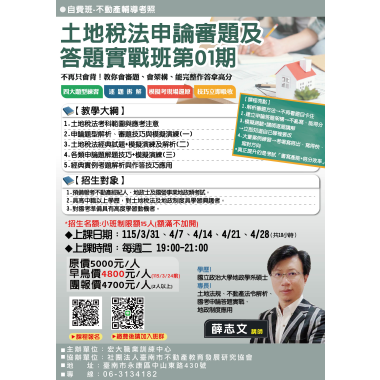 不動產類 12/13 土地坪效與坪效係數 課程介紹 我要報名 民俗調理業傳統整復推拿 114/12/26-115/3/27民俗調理業傳統整復推拿 學科及法規班 【技術士技能檢定】 民俗調理業傳統整復推拿職類專業課程 課程介紹 我要報名 自費課程 12/15-12/19 手機維修 初階實作班 課程介紹 我要報名 產業人才投資計畫課程總表 114年度下半年產業人才投資計畫之課程總覽 政府補助 三年十萬 課程介紹 我要報名 製造業&服務業 114/12/13、12/14 智能辦公 AI 速成班 1.滿10人開課 2.報名前請詳看資訊說明 課程介紹 我要報名 不動產類 12/14 不動產案例解析專題講座11-漏水瑕疵全攻略 房仲最常見的瑕疵爭議 課程介紹 我要報名 不動產類 1216 房東租賃管理經營實務班 課程介紹 我要報名 不動產類 12/20 不動產案例解析專題 到底是真的?還是假的? 「假扣押」、「假處分」、「假執行」不動產訴訟案例解析 課程介紹 我要報名 不動產類 115/01/13-不動產特殊規定解析班 【不動產實務課程】【專業講師】 課程介紹 我要報名 不動產實務 【165220】114/11/17 非都市土地變更使用實務解析班第01期 政府補助 三年十萬 課程介紹 我要報名 製造業&服務業 短影片行銷班 1.滿10人開課 2.報名前請詳看資訊說明 課程介紹 我要報名 不動產證照補助 114(下)年度 地政士考照班 政府補助 三年十萬 【按下課程介紹】 依照各科的報名區間,連結至台灣就業通報名,謝謝!! 課程介紹 我要報名 地政士考照 114(下)年度 地政士考照班 政府補助 三年十萬 【按下課程介紹】 依照各科的報名區間,連結至台灣就業通報名,謝謝!! 課程介紹 我要報名 製造業&服務業 短影音流量經營班 1.滿10人開課 2.報名前請詳看資訊說明 課程介紹 我要報名 製造業&服務業 品牌社群經營攻略 1.滿10人開課 2.報名前請詳看資訊說明 課程介紹 我要報名 人力資源與管理 【164811】114/11/30 企業永續報告書撰寫實務班第01期 政府補助 三年十萬 課程介紹 我要報名 人力資源與管理 【164812】114/12/18 碳中和實務班第01期 政府補助 三年十萬 課程介紹 我要報名 不動產類 115-03/31、04/07、04/21、04/28 土地稅法申論審題及答題實戰班第01期 課程介紹 我要報名 不動產類 115/2/10、2/24、3/3、3/10、3/17 土地登記實務申論審題及答題實戰班第01期 課程介紹 我要報名 人力資源與管理 【164945】114/12/12 就業服務人力仲介及管理班第01期 政府補助 三年十萬 課程介紹 我要報名 觀光休閒旅遊 【164998】114/12/06 觀光導遊領隊人員實務班第02期 政府補助 三年十萬 課程介紹 我要報名 不動產實務 【165222】114/12/11 共有土地紛爭實例處理解析班第01期 政府補助 三年十萬 課程介紹 我要報名 人力資源與管理 【164813】114/12/28淨零碳規劃管理人員培訓實務班第01期 政府補助 三年十萬 課程介紹 我要報名 領隊導遊證照 【115/2/3、2/5、2/7領隊考前】 & 【115/3/3、3/5、3/7 導遊】考前總複習班 **難得機會**學員優惠** **專業講師、專業課程** 課程介紹 我要報名 不動產類 115/1/17、1/24 法拍實戰班 課程介紹 我要報名 不動產經紀營業員-新訓 (首次) 114(下) 12/13、14、12/20、12/21不動產經紀營業員(新訓) **請詳讀【課程介紹】與【報名須知】** **報名後請務必加入班群** 課程介紹 我要報名 不動產經紀營業員-新訓 (首次) 115(上) 1/6- 1/9 不動產經紀營業員(新訓) **請詳讀【課程介紹】與【報名須知】** **報名後請務必加入班群** 課程介紹 我要報名 不動產經紀營業員-複訓 (複訓) 114(下) 12/29-12/31 不動產經紀營業員(複訓) **請詳讀【課程介紹】與【報名須知】** **報名後請務必加入班群** 課程介紹 我要報名 不動產經紀營業員-新訓 (首次) 115(上) 2/3-2/6 不動產經紀營業員(新訓) **請詳讀【課程介紹】與【報名須知】** **報名後請務必加入班群** 課程介紹 我要報名 不動產經紀營業員-複訓 (複訓) A班-115(上) 1/20-22 不動產經紀營業員(複訓) **請詳讀【課程介紹】與【報名須知】** **報名後請務必加入班群** 課程介紹 我要報名 不動產經紀營業員-新訓 (首次) 115(上) 3/10-3/13 不動產經紀營業員(新訓) **請詳讀【課程介紹】與【報名須知】** **報名後請務必加入班群** 課程介紹 我要報名 不動產經紀營業員-新訓 (首次) 115(上) 4/14-4/17不動產經紀營業員(新訓) **請詳讀【課程介紹】與【報名須知】** **報名後請務必加入班群** 課程介紹 我要報名 不動產經紀營業員-複訓 (複訓) A班-115(上) 2/24-2/26 不動產經紀營業員(複訓) **請詳讀【課程介紹】與【報名須知】** **報名後請務必加入班群** 課程介紹 我要報名 不動產經紀營業員-複訓 (複訓) A班-115(上) 3/24-3/26 不動產經紀營業員(複訓) **請詳讀【課程介紹】與【報名須知】** **報名後請務必加入班群** 課程介紹 我要報名 不動產經紀營業員-複訓 (複訓) A班-115(上) 4/28-4/30 不動產經紀營業員(複訓) **請詳讀【課程介紹】與【報名須知】** **報名後請務必加入班群** 課程介紹 我要報名 不動產經紀營業員-新訓 (首次) 115(上) 03/14、03/15、03/21、03/22 不動產經紀營業員 (新訓) 假日班 **請詳讀【課程介紹】與【報名須知】** **報名後請務必加入班群** 課程介紹 我要報名 已開過課程 114/11/11-11/14 不動產經紀人複訓 課程介紹 我要報名 已開過課程 【165203】114/09/13 就業服務人力仲介及管理班第01期 政府補助 三年十萬 課程介紹 我要報名 已開過課程 114年8月4