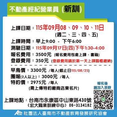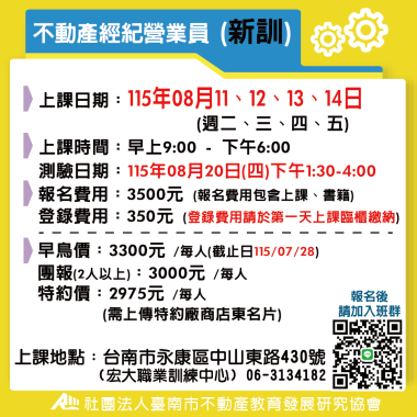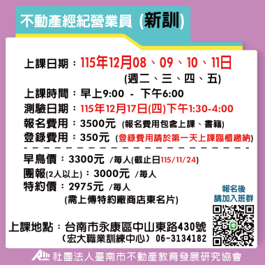 115(上) 03/14、03/15、03/21、03/22 不動產經紀營業員 (新訓) 假日班
