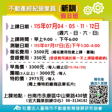 115(上) 05/16、05/17、05/23、05/24 不動產經紀營業員 (新訓) 假日班