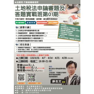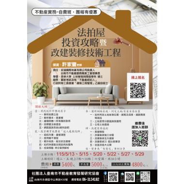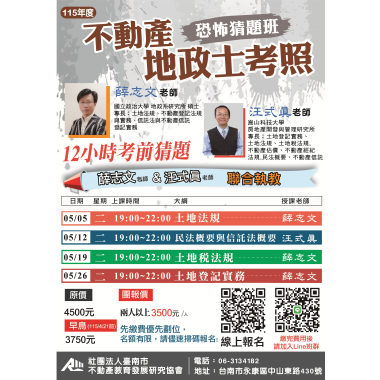 不動產經紀營業員-複訓 (複訓) 宏大職訓中心~不動營業員報名流程,請先閱覽! 課程介紹 我要報名 不動產經紀營業員-新訓 (首次) 宏大職訓中心~不動營業員報名流程,請先閱覽! 課程介紹 我要報名 不動產經紀營業員-複訓 (複訓) 不動產營業員(複訓) 注意事項說明 報名前,請詳細閱讀 課程介紹 我要報名 不動產經紀營業員-新訓 (首次) 不動產營業員(新訓)退費 注意事項說明 報名前,請詳細閱讀 課程介紹 我要報名 不動產類 115/3/21(六) 到底是真的? 還是假的?「假扣押」 「假處分」、「假執行」 不動產訴訟案例解析 課程介紹 我要報名 不動產經紀人 115年(上)-4/21-4/24-不動產經紀人平日複訓班 課程介紹 我要報名 不動產證照補助 115(上)年度 地政士考照班 政府補助 三年十萬 【按下課程介紹】 依照各科的報名區間,連結至台灣就業通報名,謝謝!! 課程介紹 我要報名 自費課程 115/3/6、3/7 就業服務乙級術科考前總複習暨衝刺班 課程介紹 我要報名 人力資源與管理 【169127】115/3/7-115/4/11 淨零碳規劃管理人員培訓第02期 政府補助 三年十萬 課程介紹 我要報名 已開過課程 10/17、10/24、10/25、10/31、11/01 不動產經紀人考照-恐怖猜題班 課程介紹 我要報名 不動產類 115-03/31、04/07、04/21、04/28 土地稅法申論審題及答題實戰班第01期 課程介紹 我要報名 不動產實務 【168089】115/03/10-05/26農地農舍與建築管制法規實務解析班第02期 政府補助 三年十萬 課程介紹 我要報名 觀光休閒旅遊 【169121】115/3/18-115/6/24 府城觀光日語導覽實務班第01期 政府補助 三年十萬 課程介紹 我要報名 不動產類 115/04/25(六) 通行權土地開發爭議案例解析 課程介紹 我要報名 人力資源與管理 【168197】115/3/20-115/6/5 就業服務人力仲介管理班第02期 政府補助 三年十萬 課程介紹 我要報名 不動產類 115年 0505、0512、0519、0526 地政士考照恐怖猜題班 課程介紹 我要報名 人力資源與管理 【169128】115/3/24-115/6/9 ESG與碳盤查查證人員訓練班第02期 政府補助 三年十萬 課程介紹 我要報名 電腦數位科技 【168938】115/3/24-115/6/30 AI智慧社群經營與廣告投放實戰班第02期 政府補助 三年十萬 課程介紹 我要報名 積分課程 115/3/21 生活輔具實作班-自己動手做 6H (7.2積分) 課程介紹 我要報名 不動產類 115/05/13 法拍屋投資攻略暨改建裝修技術工程 【不動產實務課程】【專業講師】 課程介紹 我要報名 不動產實務 115/3/30-6/22 非都市土地變更使用實務解析班第01期 政府補助 三年十萬 課程介紹 我要報名 電腦數位科技 【168939】115/4/1-115/7/8 AI影像創作與新媒體行銷應用班第01期 政府補助 三年十萬 課程介紹 我要報名 觀光休閒旅遊 【168147】115/4/7-115/7/7 樂齡運動指導員培力實務班第04期 政府補助 三年十萬 課程介紹 我要報名 不動產經紀營業員-新訓 (首次) 115(上) 4/14-4/17不動產經紀營業員(新訓) **請詳讀【課程介紹】與【報名須知】** **報名後請務必加入班群** 課程介紹 我要報名 觀光休閒旅遊 【169122】115/4/9-115/6/11台南山線城市在地導覽解說班第01期 政府補助 三年十萬 課程介紹 我要報名 已開過課程 【164809】114/10/14 ESG與碳盤查查證人員訓練班第01期 政府補助 三年十萬 課程介紹 我要報名 觀光休閒旅遊 【168150】115/4/11-115/6/6 銀髮族府城慢旅導覽解說與遊程設計班第01期 政府補助 三年十萬 課程介紹 我要報名 不動產經紀營業員-複訓 (複訓) B班-115(上) 4/28-4/30 不動產經紀營業員(複訓) **請詳讀【課程介紹】與【報名須知】** **報名後請務必加入班群** 課程介紹 我要報名 電腦數位科技 【168051】115/4/13-115/7/20 AI創新設計與數位內容製作實務班第01期 政府補助 三年十萬 課程介紹 我要報名 不動產經紀營業員-新訓 (首次) 115(上) 5/12- 5/15 不動產經紀營業員(新訓) **請詳讀【課程介紹】與【報名須知】** **報名後請務必加入班群** 課程介紹 我要報名 觀光休閒旅遊 【168278】115/4/14-115/7/21 手語多元技能基礎班第01期 政府補助 三年十萬 課程介紹 我要報名 不動產經紀營業員-新訓 (首次) 115(上) 05/16、05/17、05/23、05/24 不動產經紀營業員 (新訓) 假日班 **請詳讀【課程介紹】與【報名須知】** **報名後請務必加入班群** 課程介紹 我要報名 觀光休閒旅遊 【169123】115/4/14-115/6/2 旅遊產業行動Canva行銷設計與AI實務班第01期 政府補助 三年十萬 課程介紹 我要報名 不動產經紀營業員-複訓 (複訓) A班-115(上) 5/26-5/28 不動產經紀營業員(複訓) **請詳讀【課程介紹】與【報名須知】** **報名後請務必加入班群** 課程介紹 我要報名 不動產證照補助 115(上) 不動產經紀人輔導考照班系列課程 政府補助 三年十萬 【按下課程介紹】 依照各科的報名區間,連結至台灣就業通報名,謝謝!! 課程介紹 我要報名 人力資源與管理 【168053】115/04/18-115/05/2勞資事件法令及勞資爭議處理實務班第01期 政府補助 三年十萬 課程介紹 我要報名 不動產經紀營業員-新訓 (首次) 115(上) 6/9-6/12 不動產經紀營業員(新訓) **請詳讀【課程介紹】與【報名須知】** **報名後請務必加入班群** 課程介紹 我要報名 電腦數位科技 【168198】115/04/21-115/07/28AI創新設計與品牌多媒體整合班第01期 政府補助 三年十萬 課程介紹 我要報名 不動產經紀營業員-複訓 (複訓) A班-115(上) 6/23-6/25 不動產經紀營業員(複訓) **請詳讀【課程介紹】與【報名須知】** **報名後請務必加入班群*