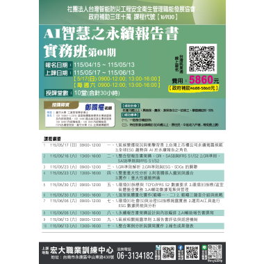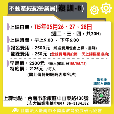 不動產經紀營業員-複訓 (複訓) 宏大職訓中心~不動營業員報名流程,請先閱覽! 課程介紹 我要報名 不動產經紀營業員-新訓 (首次) 宏大職訓中心~不動營業員報名流程,請先閱覽! 課程介紹 我要報名 不動產經紀營業員-複訓 (複訓) 不動產營業員(複訓) 注意事項說明 報名前,請詳細閱讀 課程介紹 我要報名 不動產經紀營業員-新訓 (首次) 不動產營業員(新訓)退費 注意事項說明 報名前,請詳細閱讀 課程介紹 我要報名 不動產類 115/6/13 專題講座-遺產如何分?遺囑如何寫? 📢 專題講座-遺囑寫作實作班--👥 適合對象:一般大眾、50歲以上長者. 對財產安排、遺囑書寫有興趣的民眾.退休族群、即將安排人生後事者 課程介紹 我要報名 已開過課程 10/17、10/24、10/25、10/31、11/01 不動產經紀人考照-恐怖猜題班 課程介紹 我要報名 已開過課程 【168089】115/03/10-05/26農地農舍與建築管制法規實務解析班第02期 政府補助 三年十萬 課程介紹 我要報名 地政士考照 115年 0505、0512、0519、0526 地政士考照恐怖猜題班 課程介紹 我要報名 不動產類 115/05/13 法拍屋投資攻略暨改建裝修技術工程 【不動產實務課程】【專業講師】 課程介紹 我要報名 已開過課程 【164809】114/10/14 ESG與碳盤查查證人員訓練班第01期 政府補助 三年十萬 課程介紹 我要報名 觀光休閒旅遊 【168150】115/4/18-115/6/13銀髮族府城慢旅導覽解說與遊程設計班第01期 政府補助 三年十萬 課程介紹 我要報名 不動產經紀營業員-新訓 (首次) 115(上) 5/12- 5/15 不動產經紀營業員(新訓) **請詳讀【課程介紹】與【報名須知】** **報名後請務必加入班群** 課程介紹 我要報名 觀光休閒旅遊 【169123】115/5/5-115/6/23 旅遊產業行動Canva行銷設計與AI實務班第01期 政府補助 三年十萬 課程介紹 我要報名 不動產經紀營業員-複訓 (複訓) A班-115(上) 5/26-5/28 不動產經紀營業員(複訓) **請詳讀【課程介紹】與【報名須知】** **報名後請務必加入班群** 課程介紹 已額滿 不動產證照補助 115(上) 不動產經紀人輔導考照班系列課程 政府補助 三年十萬 【按下課程介紹】 依照各科的報名區間,連結至台灣就業通報名,謝謝!! 課程介紹 我要報名 不動產經紀營業員-複訓 (複訓) B班-115(上) 5/26-5/28 不動產經紀營業員(複訓) **請詳讀【課程介紹】與【報名須知】** **報名後請務必加入班群** 課程介紹 我要報名 不動產經紀營業員-新訓 (首次) 115(上) 6/9-6/12 不動產經紀營業員(新訓) **請詳讀【課程介紹】與【報名須知】** **報名後請務必加入班群** 課程介紹 我要報名 電腦數位科技 【168198】115/04/21-115/07/28AI創新設計與品牌多媒體整合班第01期 政府補助 三年十萬 課程介紹 我要報名 不動產經紀營業員-複訓 (複訓) A班-115(上) 6/23-6/25 不動產經紀營業員(複訓) **請詳讀【課程介紹】與【報名須知】** **報名後請務必加入班群** 課程介紹 我要報名 健康運動管理 【168148】115/04/27-115/07/27樂齡運動帶領與設計實務班第01期 政府補助 三年十萬 課程介紹 我要報名 不動產經紀營業員-新訓 (首次) 115(下) 7/04-7/12 不動產經紀營業員(新訓) 假日班 **請詳讀【課程介紹】與【報名須知】** **報名後請務必加入班群** 課程介紹 我要報名 人力資源與管理 【169129】115/05/13-115/07/01碳中和實務班第02期 政府補助 三年十萬 課程介紹 我要報名 不動產經紀營業員-新訓 (首次) 115(下) 7/14-7/17 不動產經紀營業員(新訓) **請詳讀【課程介紹】與【報名須知】** **報名後請務必加入班群** 課程介紹 我要報名 不動產經紀營業員-複訓 (複訓) A班-115(下) 7/28-7/30 不動產經紀營業員(複訓) **請詳讀【課程介紹】與【報名須知】** **報名後請務必加入班群** 課程介紹 我要報名 不動產證照補助 【168442】115/05/12-115/08/04不動產經紀人法規與實務訓練班第01期 政府補助 三年十萬 課程介紹 我要報名 不動產經紀營業員-新訓 (首次) 115(下) 8/11-8/14 不動產經紀營業員(新訓) **請詳讀【課程介紹】與【報名須知】** **報名後請務必加入班群** 課程介紹 我要報名 電腦數位科技 【168054】115/05/15-115/07/24 AI協作Office打造高效工作流班第01期 政府補助 三年十萬 課程介紹 我要報名 人力資源與管理 【169130】115/05/17-115/06/13AI智慧之永續報告書實務班第01期 政府補助 三年十萬 課程介紹 我要報名 不動產經紀營業員-新訓 (首次) 115(下) 8/15-8/23 不動產經紀營業員(新訓) 假日班 **請詳讀【課程介紹】與【報名須知】** **報名後請務必加入班群** 課程介紹 我要報名 不動產經紀營業員-複訓 (複訓) A班-115(下) 8/25-8/27 不動產經紀營業員(複訓) **請詳讀【課程介紹】與【報名須知】** **報名後請務必加入班群** 課程介紹 我要報名 職場語言 【168279】115/05/18- 115/08/24手語多元技能進階班第01期 政府補助 三年十萬 課程介紹 我要報名 不動產經紀營業員-新訓 (首次) 115(下) 9/08-9/11 不動產經紀營業員(新訓) **請詳讀【課程介紹】與【報名須知】** **報名後請務必加入班群** 課程介紹 我要報名 不動產實務 【168090】115/06/03-115/08/05不動產信託與法規實務班第03期 政府補助 三年十萬 課程介紹 我要報名 不動產經紀營業員-複訓 (複訓) A班-115(下) 9/22-9/24 不動產經紀營業員(複訓) **請詳讀【課程介紹】與【報名須知】** **報名後請務必加入班群** 課程介紹 我要報名 人力資源與管理 【169131】115/06/04-115/08/06ESG與產品碳足跡查證人
