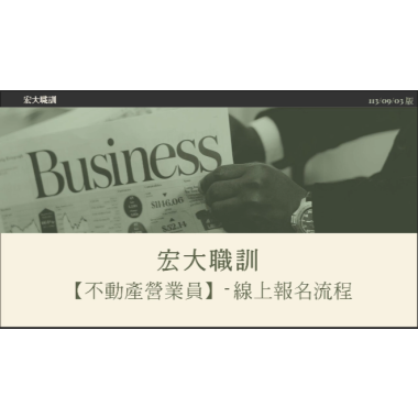不動產經紀營業員-複訓 (複訓) 宏大職訓中心~不動營業員報名流程,請先閱覽! 課程介紹 我要報名 不動產經紀營業員-新訓 (首次) 宏大職訓中心~不動營業員報名流程,請先閱覽! 課程介紹 我要報名 不動產經紀營業員-複訓 (複訓) 不動產營業員(複訓) 注意事項說明 報名前,請詳細閱讀 課程介紹 我要報名 不動產經紀營業員-新訓 (首次) 不動產營業員(新訓)退費 注意事項說明 報名前,請詳細閱讀 課程介紹 我要報名 民俗調理業傳統整復推拿 115/01/09-115/3/27 民俗調理業傳統整復推拿 學科及法規班 【技術士技能檢定】 民俗調理業傳統整復推拿職類專業課程 課程介紹 我要報名 不動產經紀營業員-複訓 (複訓) A班-115(上) 1/20-22 不動產經紀營業員(複訓) **請詳讀【課程介紹】與【報名須知】** **報名後請務必加入班群** 課程介紹 我要報名 不動產經紀營業員-新訓 (首次) 115(上) 1/6- 1/9 不動產經紀營業員(新訓) **請詳讀【課程介紹】與【報名須知】** **報名後請務必加入班群** 課程介紹 我要報名 不動產經紀營業員-新訓 (首次) 115(上) 2/3-2/6 不動產經紀營業員(新訓) **請詳讀【課程介紹】與【報名須知】** **報名後請務必加入班群** 課程介紹 我要報名 不動產經紀營業員-複訓 (複訓) A班-115(上) 2/24-2/26 不動產經紀營業員(複訓) **請詳讀【課程介紹】與【報名須知】** **報名後請務必加入班群** 課程介紹 我要報名 不動產經紀營業員-新訓 (首次) 115(上) 3/10-3/13 不動產經紀營業員(新訓) **請詳讀【課程介紹】與【報名須知】** **報名後請務必加入班群** 課程介紹 我要報名 不動產經紀營業員-新訓 (首次) 115(上) 03/14、03/15、03/21、03/22 不動產經紀營業員 (新訓) 假日班 **請詳讀【課程介紹】與【報名須知】** **報名後請務必加入班群** 課程介紹 我要報名 不動產經紀營業員-複訓 (複訓) A班-115(上) 3/24-3/26 不動產經紀營業員(複訓) **請詳讀【課程介紹】與【報名須知】** **報名後請務必加入班群** 課程介紹 我要報名 不動產經紀營業員-新訓 (首次) 115(上) 4/14-4/17不動產經紀營業員(新訓) **請詳讀【課程介紹】與【報名須知】** **報名後請務必加入班群** 課程介紹 我要報名 不動產經紀營業員-複訓 (複訓) A班-115(上) 4/28-4/30 不動產經紀營業員(複訓) **請詳讀【課程介紹】與【報名須知】** **報名後請務必加入班群** 課程介紹 我要報名 不動產經紀營業員-新訓 (首次) 115(上) 5/12- 5/15 不動產經紀營業員(新訓) **請詳讀【課程介紹】與【報名須知】** **報名後請務必加入班群** 課程介紹 我要報名 不動產經紀營業員-新訓 (首次) 115(上) 05/16、05/17、05/23、05/24 不動產經紀營業員 (新訓) 假日班 **請詳讀【課程介紹】與【報名須知】** **報名後請務必加入班群** 課程介紹 我要報名 不動產經紀營業員-複訓 (複訓) A班-115(上) 5/26-5/28 不動產經紀營業員(複訓) **請詳讀【課程介紹】與【報名須知】** **報名後請務必加入班群** 課程介紹 我要報名 不動產經紀營業員-新訓 (首次) 115(上) 6/9-6/12 不動產經紀營業員(新訓) **請詳讀【課程介紹】與【報名須知】** **報名後請務必加入班群** 課程介紹 我要報名 不動產經紀營業員-複訓 (複訓) A班-115(上) 6/23-6/25 不動產經紀營業員(複訓) **請詳讀【課程介紹】與【報名須知】** **報名後請務必加入班群** 課程介紹 我要報名 不動產經紀營業員-新訓 (首次) 115(下) 7/04-7/12 不動產經紀營業員(新訓) 假日班 **請詳讀【課程介紹】與【報名須知】** **報名後請務必加入班群** 課程介紹 我要報名 不動產經紀營業員-新訓 (首次) 115(下) 7/14-7/17 不動產經紀營業員(新訓) **請詳讀【課程介紹】與【報名須知】** **報名後請務必加入班群** 課程介紹 我要報名 不動產經紀營業員-複訓 (複訓) A班-115(下) 7/28-7/30 不動產經紀營業員(複訓) **請詳讀【課程介紹】與【報名須知】** **報名後請務必加入班群** 課程介紹 我要報名 不動產經紀營業員-新訓 (首次) 115(下) 8/11-8/14 不動產經紀營業員(新訓) **請詳讀【課程介紹】與【報名須知】** **報名後請務必加入班群** 課程介紹 我要報名 不動產經紀營業員-新訓 (首次) 115(下) 8/15-8/23 不動產經紀營業員(新訓) 假日班 **請詳讀【課程介紹】與【報名須知】** **報名後請務必加入班群** 課程介紹 我要報名 不動產經紀營業員-複訓 (複訓) A班-115(下) 8/25-8/27 不動產經紀營業員(複訓) **請詳讀【課程介紹】與【報名須知】** **報名後請務必加入班群** 課程介紹 我要報名 不動產經紀營業員-新訓 (首次) 115(下) 9/08-9/11 不動產經紀營業員(新訓) **請詳讀【課程介紹】與【報名須知】** **報名後請務必加入班群** 課程介紹 我要報名 領隊導遊證照 【115/2/3、2/5、2/7領隊考前】 & 【115/3/3、3/5、3/7 導遊】考前總複習班 **難得機會**學員優惠** **專業講師、專業課程** 課程介紹 我要報名 不動產經紀營業員-複訓 (複訓) A班-115(下) 9/22-9/24 不動產經紀營業員(複訓) **請詳讀【課程介紹】與【報名須知】** **報名後請務必加入班群** 課程介紹 我要報名 不動產經紀營業員-新訓 (首次) 115(下) 10/13-10/15 不動產經紀營業員(新訓) **請詳讀【課程介紹】與【報名須知】** **報名後請務必加入班群** 課程介紹 我要報名 不動產經紀營業員-複訓 (複訓) A班-115(下) 10/28-10/30不動產經紀營業員(複訓) **請詳讀【課程介紹】與【報名須知】** **報名後