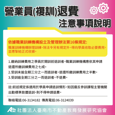 不動產經紀營業員-複訓 (複訓) 不動產營業員(複訓) 注意事項說明 報名前,請詳細閱讀 課程介紹 我要報名 不動產經紀營業員-複訓 (複訓) 114(下) 12/29-12/31 不動產經紀營業員(複訓) **請詳讀【課程介紹】與【報名須知】** **報名後請務必加入班群** 課程介紹 我要報名 不動產經紀營業員-複訓 (複訓) A班-115(上) 1/20-22 不動產經紀營業員(複訓) **請詳讀【課程介紹】與【報名須知】** **報名後請務必加入班群** 課程介紹 我要報名 不動產經紀營業員-複訓 (複訓) A班-115(上) 2/24-2/26 不動產經紀營業員(複訓) **請詳讀【課程介紹】與【報名須知】** **報名後請務必加入班群** 課程介紹 我要報名 不動產經紀營業員-複訓 (複訓) A班-115(上) 3/24-3/26 不動產經紀營業員(複訓) **請詳讀【課程介紹】與【報名須知】** **報名後請務必加入班群** 課程介紹 我要報名 不動產經紀營業員-複訓 (複訓) A班-115(上) 4/28-4/30 不動產經紀營業員(複訓) **請詳讀【課程介紹】與【報名須知】** **報名後請務必加入班群** 課程介紹 我要報名 不動產經紀營業員-複訓 (複訓) A班-115(上) 5/26-5/28 不動產經紀營業員(複訓) **請詳讀【課程介紹】與【報名須知】** **報名後請務必加入班群** 課程介紹 我要報名 不動產經紀營業員-複訓 (複訓) A班-115(上) 6/23-6/25 不動產經紀營業員(複訓) **請詳讀【課程介紹】與【報名須知】** **報名後請務必加入班群** 課程介紹 我要報名 不動產經紀營業員-複訓 (複訓) A班-115(下) 7/28-7/30 不動產經紀營業員(複訓) **請詳讀【課程介紹】與【報名須知】** **報名後請務必加入班群** 課程介紹 我要報名 不動產經紀營業員-複訓 (複訓) A班-115(下) 8/25-8/27 不動產經紀營業員(複訓) **請詳讀【課程介紹】與【報名須知】** **報名後請務必加入班群** 課程介紹 我要報名 不動產經紀營業員-複訓 (複訓) A班-115(下) 9/22-9/24 不動產經紀營業員(複訓) **請詳讀【課程介紹】與【報名須知】** **報名後請務必加入班群** 課程介紹 我要報名 不動產經紀營業員-複訓 (複訓) A班-115(下) 10/28-10/30不動產經紀營業員(複訓) **請詳讀【課程介紹】與【報名須知】** **報名後請務必加入班群** 課程介紹 我要報名 不動產經紀營業員-複訓 (複訓) A班-115(下) 111/24-11/26 不動產經紀營業員(複訓) **請詳讀【課程介紹】與【報名須知】** **報名後請務必加入班群** 課程介紹 我要報名 不動產經紀營業員-複訓 (複訓) A班-115(下) 12/22-12/24 不動產經紀營業員(複訓) **請詳讀【課程介紹】與【報名須知】** **報名後請務必加入班群** 課程介紹 我要報名