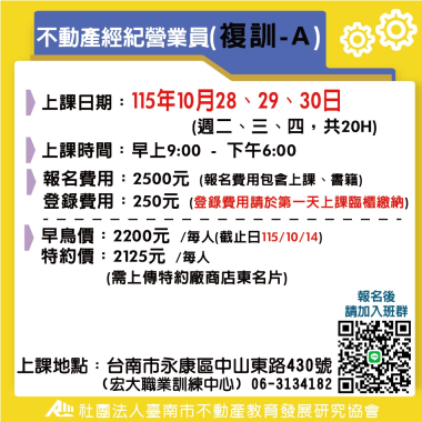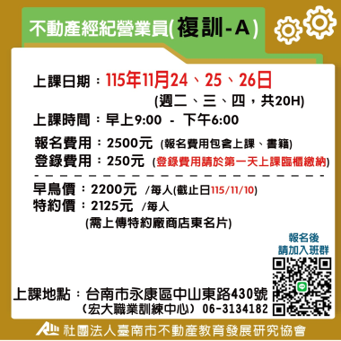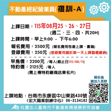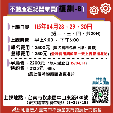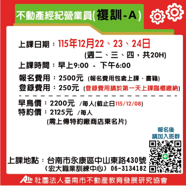 不動產經紀營業員-複訓 (複訓) 宏大職訓中心~不動營業員報名流程,請先閱覽! 課程介紹 我要報名 不動產經紀營業員-複訓 (複訓) 不動產營業員(複訓) 注意事項說明 報名前,請詳細閱讀 課程介紹 我要報名 不動產經紀營業員-複訓 (複訓) B班-115(上) 4/28-4/30 不動產經紀營業員(複訓) **請詳讀【課程介紹】與【報名須知】** **報名後請務必加入班群** 課程介紹 我要報名 不動產經紀營業員-複訓 (複訓) A班-115(上) 5/26-5/28 不動產經紀營業員(複訓) **請詳讀【課程介紹】與【報名須知】** **報名後請務必加入班群** 課程介紹 我要報名 不動產經紀營業員-複訓 (複訓) A班-115(上) 6/23-6/25 不動產經紀營業員(複訓) **請詳讀【課程介紹】與【報名須知】** **報名後請務必加入班群** 課程介紹 我要報名 不動產經紀營業員-複訓 (複訓) A班-115(下) 7/28-7/30 不動產經紀營業員(複訓) **請詳讀【課程介紹】與【報名須知】** **報名後請務必加入班群** 課程介紹 我要報名 不動產經紀營業員-複訓 (複訓) A班-115(下) 8/25-8/27 不動產經紀營業員(複訓) **請詳讀【課程介紹】與【報名須知】** **報名後請務必加入班群** 課程介紹 我要報名 不動產經紀營業員-複訓 (複訓) A班-115(下) 9/22-9/24 不動產經紀營業員(複訓) **請詳讀【課程介紹】與【報名須知】** **報名後請務必加入班群** 課程介紹 我要報名 不動產經紀營業員-複訓 (複訓) A班-115(下) 10/28-10/30不動產經紀營業員(複訓) **請詳讀【課程介紹】與【報名須知】** **報名後請務必加入班群** 課程介紹 我要報名 不動產經紀營業員-複訓 (複訓) A班-115(下) 11/24-11/26 不動產經紀營業員(複訓) **請詳讀【課程介紹】與【報名須知】** **報名後請務必加入班群** 課程介紹 我要報名 不動產經紀營業員-複訓 (複訓) A班-115(下) 12/22-12/24 不動產經紀營業員(複訓) **請詳讀【課程介紹】與【報名須知】** **報名後請務必加入班群** 課程介紹 我要報名