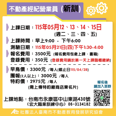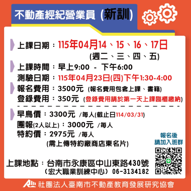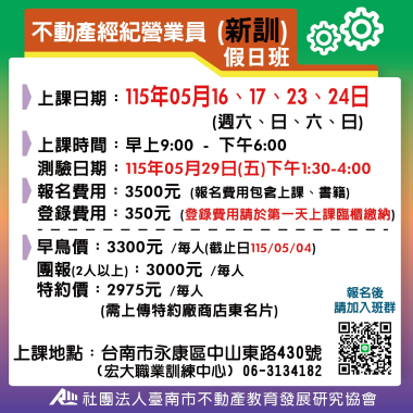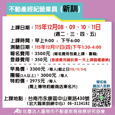 不動產經紀營業員-新訓 (首次) 宏大職訓中心~不動營業員報名流程,請先閱覽! 課程介紹 我要報名 不動產經紀營業員-新訓 (首次) 不動產營業員(新訓)退費 注意事項說明 報名前,請詳細閱讀 課程介紹 我要報名 不動產經紀營業員-新訓 (首次) 115(上) 4/14-4/17不動產經紀營業員(新訓) **請詳讀【課程介紹】與【報名須知】** **報名後請務必加入班群** 課程介紹 我要報名 不動產經紀營業員-新訓 (首次) 115(上) 5/12- 5/15 不動產經紀營業員(新訓) **請詳讀【課程介紹】與【報名須知】** **報名後請務必加入班群** 課程介紹 我要報名 不動產經紀營業員-新訓 (首次) 115(上) 05/16、05/17、05/23、05/24 不動產經紀營業員 (新訓) 假日班 **請詳讀【課程介紹】與【報名須知】** **報名後請務必加入班群** 課程介紹 我要報名 不動產經紀營業員-新訓 (首次) 115(上) 6/9-6/12 不動產經紀營業員(新訓) **請詳讀【課程介紹】與【報名須知】** **報名後請務必加入班群** 課程介紹 我要報名 不動產經紀營業員-新訓 (首次) 115(下) 7/04-7/12 不動產經紀營業員(新訓) 假日班 **請詳讀【課程介紹】與【報名須知】** **報名後請務必加入班群** 課程介紹 我要報名 不動產經紀營業員-新訓 (首次) 115(下) 7/14-7/17 不動產經紀營業員(新訓) **請詳讀【課程介紹】與【報名須知】** **報名後請務必加入班群** 課程介紹 我要報名 不動產經紀營業員-新訓 (首次) 115(下) 8/11-8/14 不動產經紀營業員(新訓) **請詳讀【課程介紹】與【報名須知】** **報名後請務必加入班群** 課程介紹 我要報名 不動產經紀營業員-新訓 (首次) 115(下) 8/15-8/23 不動產經紀營業員(新訓) 假日班 **請詳讀【課程介紹】與【報名須知】** **報名後請務必加入班群** 課程介紹 我要報名 不動產經紀營業員-新訓 (首次) 115(下) 9/08-9/11 不動產經紀營業員(新訓) **請詳讀【課程介紹】與【報名須知】** **報名後請務必加入班群** 課程介紹 我要報名 不動產經紀營業員-新訓 (首次) 115(下) 10/13-10/15 不動產經紀營業員(新訓) **請詳讀【課程介紹】與【報名須知】** **報名後請務必加入班群** 課程介紹 我要報名 不動產經紀營業員-新訓 (首次) 115(下) 11/10-11/13 不動產經紀營業員(新訓) **請詳讀【課程介紹】與【報名須知】** **報名後請務必加入班群** 課程介紹 我要報名 不動產經紀營業員-新訓 (首次) 115(下) 11/14-11/22 不動產經紀營業員(新訓) 假日班 **請詳讀【課程介紹】與【報名須知】** **報名後請務必加入班群** 課程介紹 我要報名 不動產經紀營業員-新訓 (首次) 115(下) 12/8-12/11 不動產經紀營業員(新訓) **請詳讀【課程介紹】與【報名須知】** **報名後請務必加入班群** 課程介紹 我要報名