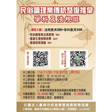 114/11/5-115/1/23 民俗調理業傳統整復推拿 學科及法規班