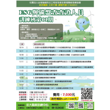 人力資源與管理 【164809】114/10/14 ESG與碳盤查查證人員訓練班第01期 政府補助 三年十萬 課程介紹 我要報名 人力資源與管理 【164810】114/11/2 ESG與產品碳足跡查證人員訓練班第01期 政府補助 三年十萬 課程介紹 我要報名 人力資源與管理 【164811】114/11/30 企業永續報告書撰寫實務班第01期 政府補助 三年十萬 課程介紹 我要報名 人力資源與管理 【164812】114/12/04 碳中和實務班第01期 政府補助 三年十萬 課程介紹 我要報名 人力資源與管理 【164945】114/12/05 就業服務人力仲介及管理班第01期 政府補助 三年十萬 課程介紹 我要報名 人力資源與管理 【164813】114/12/21 淨零碳規劃管理人員培訓實務班第01期 政府補助 三年十萬 課程介紹 我要報名