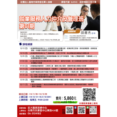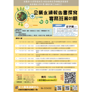 人力資源與管理 【164811】114/11/30 企業永續報告書撰寫實務班第01期 政府補助 三年十萬 課程介紹 我要報名 人力資源與管理 【164812】114/12/18 碳中和實務班第01期 政府補助 三年十萬 課程介紹 我要報名 人力資源與管理 【164945】114/12/12 就業服務人力仲介及管理班第01期 政府補助 三年十萬 課程介紹 我要報名 人力資源與管理 【164813】114/12/28淨零碳規劃管理人員培訓實務班第01期 政府補助 三年十萬 課程介紹 我要報名