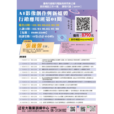 電腦數位科技 【168938】115/3/24-115/6/30 AI智慧社群經營與廣告投放實戰班第02期 政府補助 三年十萬 課程介紹 我要報名 電腦數位科技 【168939】115/4/1-115/7/8 AI影像創作與新媒體行銷應用班第01期 政府補助 三年十萬 課程介紹 我要報名 電腦數位科技 【168051】115/4/13-115/7/20 AI創新設計與數位內容製作實務班第01期 政府補助 三年十萬 課程介紹 我要報名