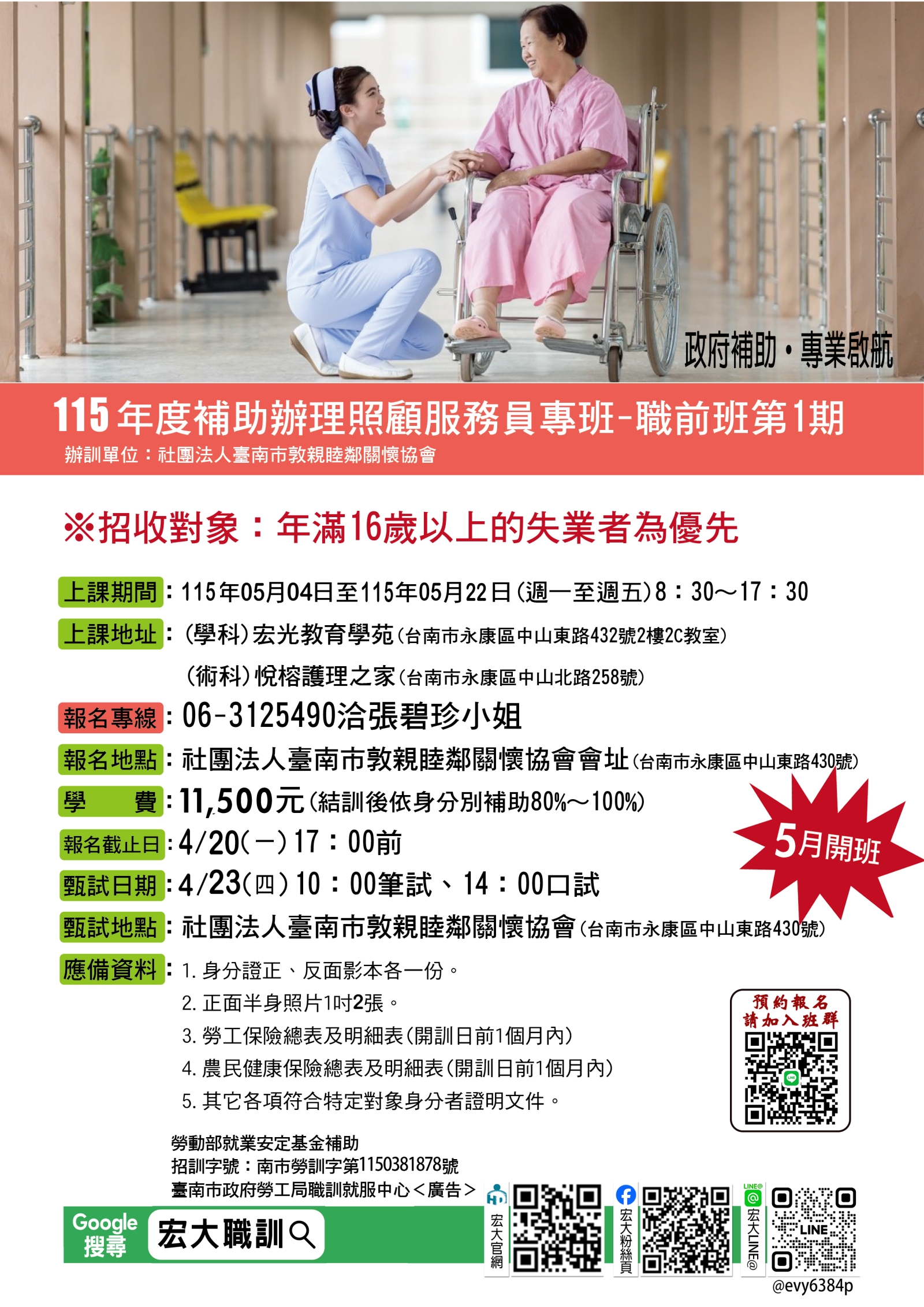 消息公告 115年度-5月份照顧服務員專班 9月份今年最後一個梯次,把握機會,錯過只能明年再來!! 歡迎有興趣的各位學員,親臨本單位-臺南市永康區中山東路430號 063134182 諮詢、報名 回列表頁