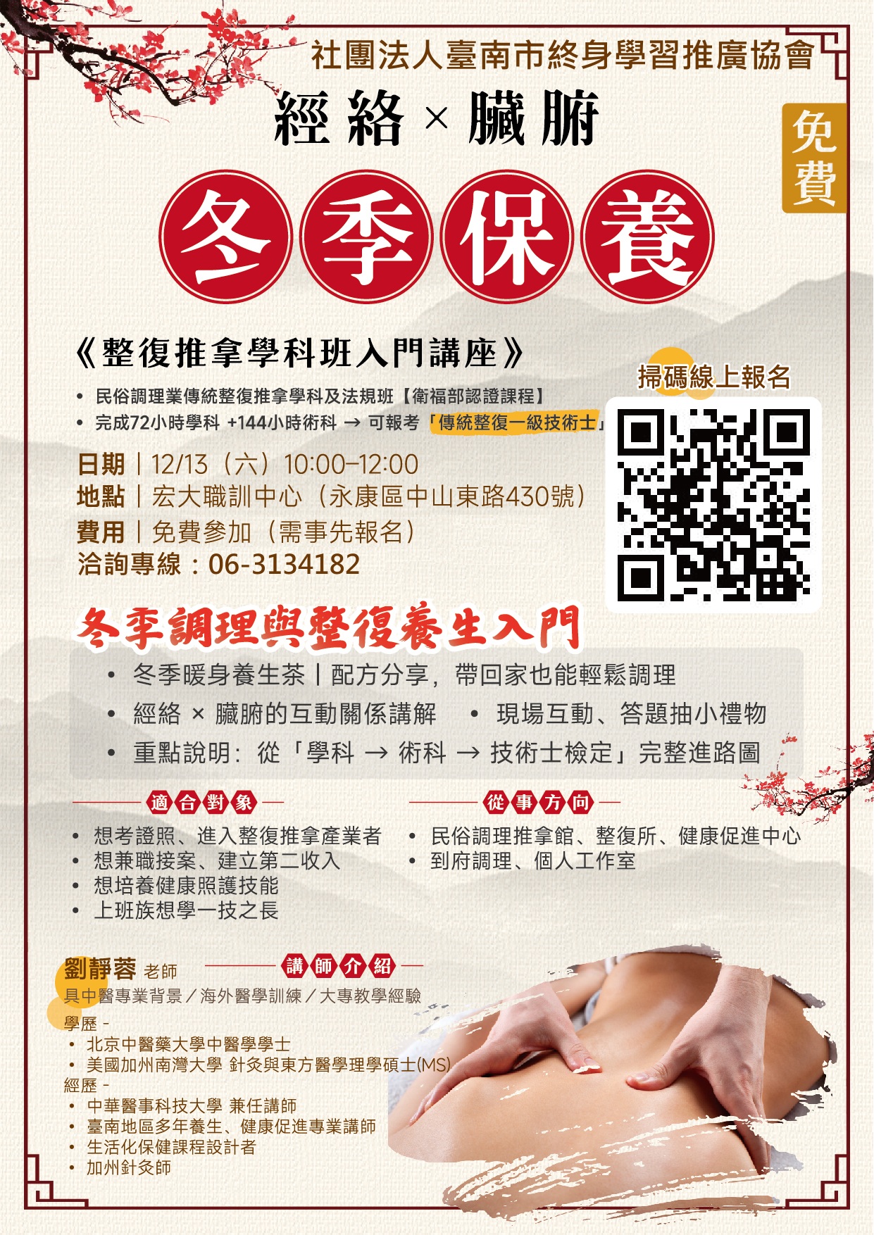12/13(六) 10:00 經絡 x 臟腑《冬季保養》整復推拿學科班 | 免費入門講座