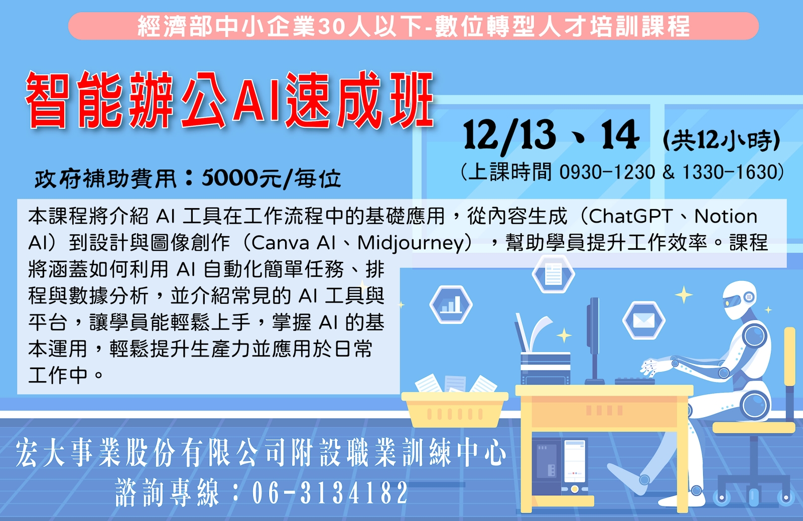 本課程將介紹 AI 工具在工作流程中的基礎應用,從內容生成(ChatGPT、Notion AI)到設計與圖像創作(Canva AI、Midjourney),幫助學員提升工作效率。課程將涵蓋如何利用 AI 自動化簡單任務、排程與數據分析,並介紹常見的 AI 工具與平台,讓學員能輕鬆上手,掌握 AI 的基本運用,輕鬆提升生產力並應用於日常工作中。