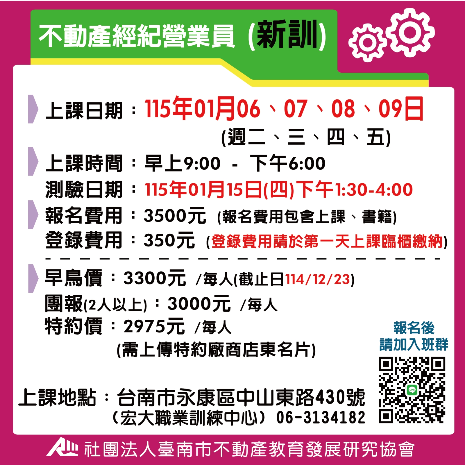 不動產經紀營業員-新訓 (首次) 115(上) 1/6- 1/9 不動產經紀營業員(新訓) 我要報名 報名費用 3500 團報費用 3000 剩餘可報名人數 27 **請詳讀【課程介紹】與【報名須知】** **報名資料:填寫不實、不完整者,將不予錄取** **報名後,請務必加入班群** 回列表頁 我要報名