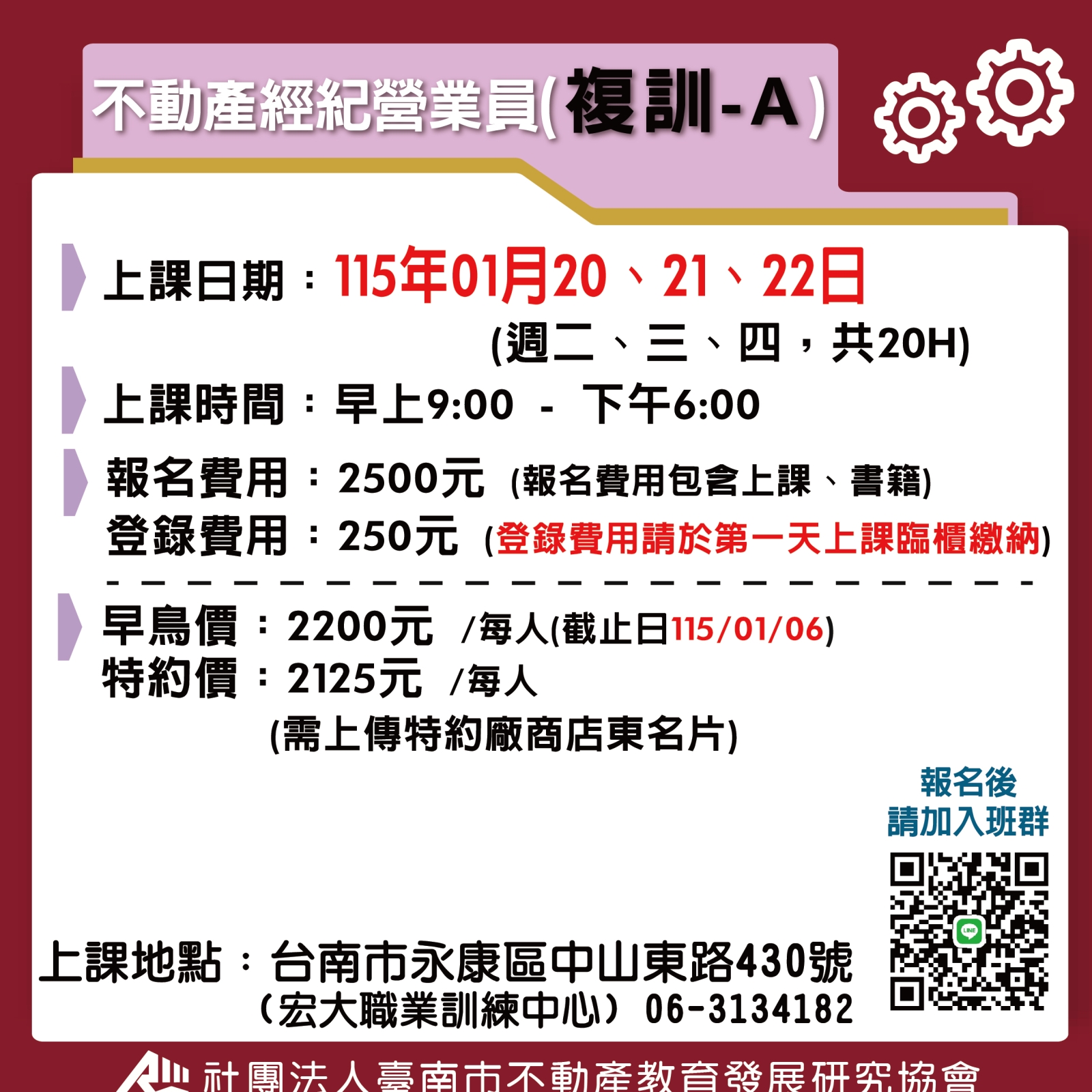 不動產經紀營業員-複訓 (複訓) A班-115(上) 1/20-22 不動產經紀營業員(複訓) 我要報名 報名費用 2500 剩餘可報名人數 48 **請詳讀【課程介紹】與【報名須知】** **報名資料:填寫不實、不完整者,將不予錄取** **報名後,請務必加入班群** 回列表頁 我要報名