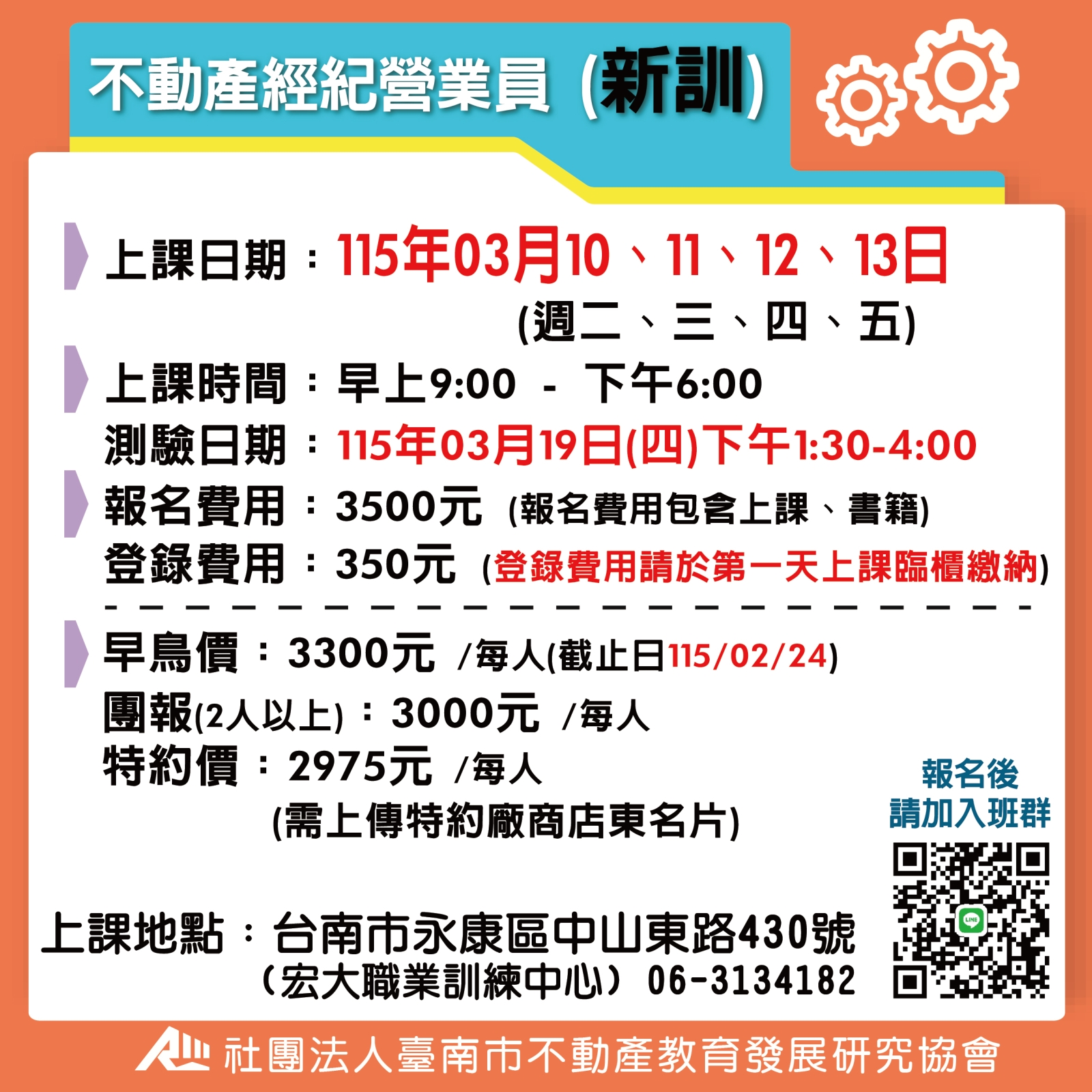不動產經紀營業員-新訓 (首次) 115(上) 3/10-3/13 不動產經紀營業員(新訓) 我要報名 報名費用 3500 團報費用 3000 剩餘可報名人數 47 **請詳讀【課程介紹】與【報名須知】** **報名資料:填寫不實、不完整者,將不予錄取** **報名後,請務必加入班群** 回列表頁 我要報名