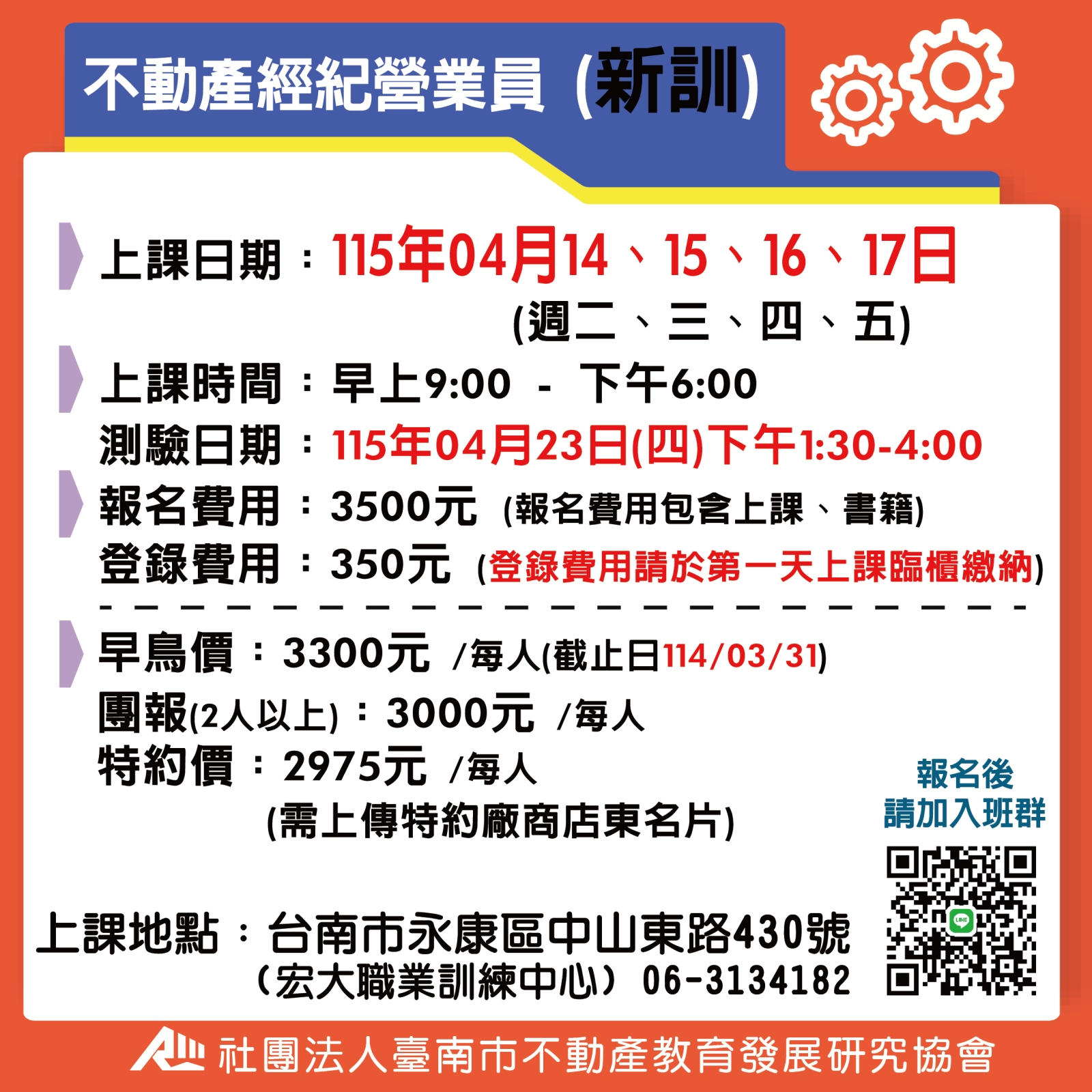 不動產經紀營業員-新訓 (首次) 115(上) 4/14-4/17不動產經紀營業員(新訓) 我要報名 報名費用 3500 團報費用 3000 剩餘可報名人數 48 **請詳讀【課程介紹】與【報名須知】** **報名資料:填寫不實、不完整者,將不予錄取** **報名後,請務必加入班群** 回列表頁 我要報名