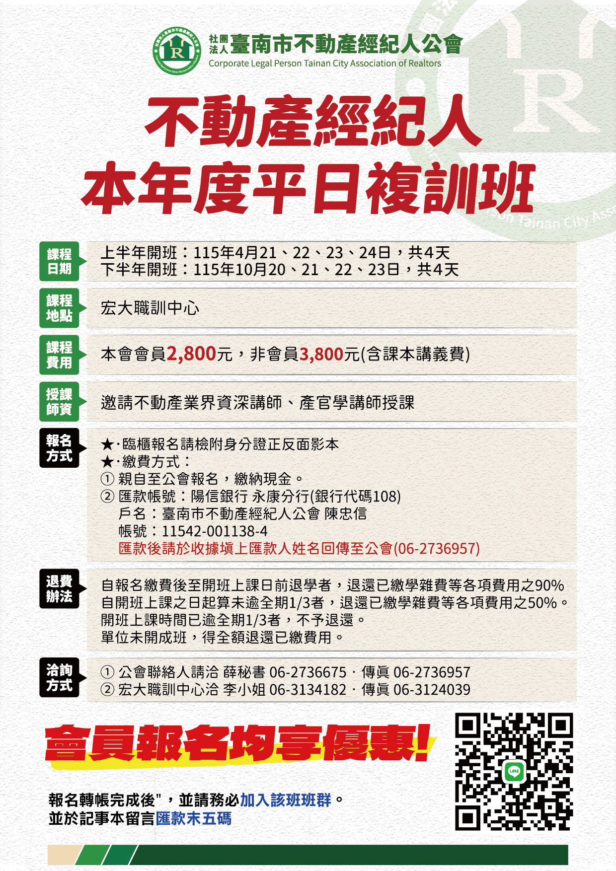 115年(上)-4/21-4/24-不動產經紀人平日複訓班