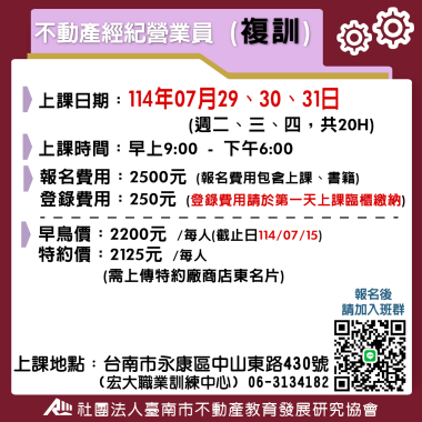 115(上) 05/16、05/17、05/23、05/24 不動產經紀營業員 (新訓) 假日班