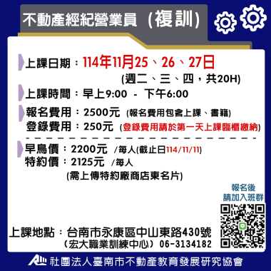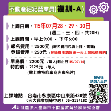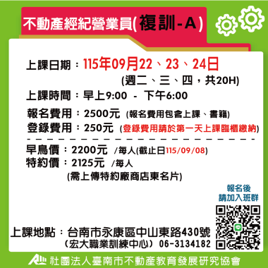不動產經紀營業員-複訓 (複訓) 不動產營業員(複訓) 注意事項說明 報名前,請詳細閱讀 課程介紹 我要報名 不動產經紀營業員-複訓 (複訓) 114(下) 12/29-12/31 不動產經紀營業員(複訓) **請詳讀【課程介紹】與【報名須知】** **報名後請務必加入班群** 課程介紹 我要報名 不動產經紀營業員-複訓 (複訓) A班-115(上) 1/20-22 不動產經紀營業員(複訓) **請詳讀【課程介紹】與【報名須知】** **報名後請務必加入班群** 課程介紹 我要報名 不動產經紀營業員-複訓 (複訓) A班-115(上) 2/24-2/26 不動產經紀營業員(複訓) **請詳讀【課程介紹】與【報名須知】** **報名後請務必加入班群** 課程介紹 我要報名 不動產經紀營業員-複訓 (複訓) A班-115(上) 3/24-3/26 不動產經紀營業員(複訓) **請詳讀【課程介紹】與【報名須知】** **報名後請務必加入班群** 課程介紹 我要報名 不動產經紀營業員-複訓 (複訓) A班-115(上) 4/28-4/30 不動產經紀營業員(複訓) **請詳讀【課程介紹】與【報名須知】** **報名後請務必加入班群** 課程介紹 我要報名 不動產經紀營業員-複訓 (複訓) A班-115(上) 5/26-5/28 不動產經紀營業員(複訓) **請詳讀【課程介紹】與【報名須知】** **報名後請務必加入班群** 課程介紹 我要報名 不動產經紀營業員-複訓 (複訓) A班-115(上) 6/23-6/25 不動產經紀營業員(複訓) **請詳讀【課程介紹】與【報名須知】** **報名後請務必加入班群** 課程介紹 我要報名 不動產經紀營業員-複訓 (複訓) A班-115(下) 7/28-7/30 不動產經紀營業員(複訓) **請詳讀【課程介紹】與【報名須知】** **報名後請務必加入班群** 課程介紹 我要報名 不動產經紀營業員-複訓 (複訓) A班-115(下) 8/25-8/27 不動產經紀營業員(複訓) **請詳讀【課程介紹】與【報名須知】** **報名後請務必加入班群** 課程介紹 我要報名 不動產經紀營業員-複訓 (複訓) A班-115(下) 9/22-9/24 不動產經紀營業員(複訓) **請詳讀【課程介紹】與【報名須知】** **報名後請務必加入班群** 課程介紹 我要報名 不動產經紀營業員-複訓 (複訓) A班-115(下) 10/28-10/30不動產經紀營業員(複訓) **請詳讀【課程介紹】與【報名須知】** **報名後請務必加入班群** 課程介紹 我要報名 不動產經紀營業員-複訓 (複訓) A班-115(下) 111/24-11/26 不動產經紀營業員(複訓) **請詳讀【課程介紹】與【報名須知】** **報名後請務必加入班群** 課程介紹 我要報名 不動產經紀營業員-複訓 (複訓) A班-115(下) 12/22-12/24 不動產經紀營業員(複訓) **請詳讀【課程介紹】與【報名須知】** **報名後請務必加入班群** 課程介紹 我要報名