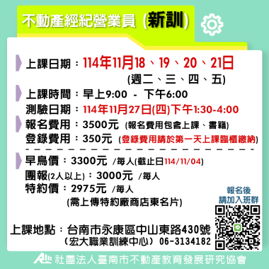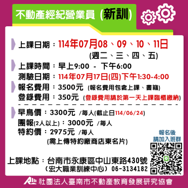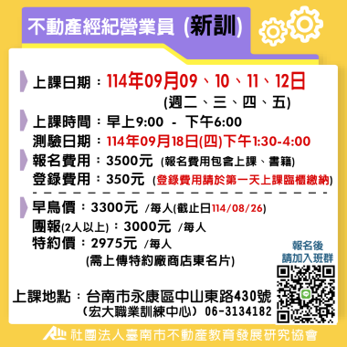 不動產經紀營業員-新訓 (首次) 不動產營業員(新訓)退費 注意事項說明 報名前,請詳細閱讀 課程介紹 我要報名 不動產經紀營業員-新訓 (首次) 115(上) 1/6- 1/9 不動產經紀營業員(新訓) **請詳讀【課程介紹】與【報名須知】** **報名後請務必加入班群** 課程介紹 我要報名 不動產經紀營業員-新訓 (首次) 115(上) 2/3-2/6 不動產經紀營業員(新訓) **請詳讀【課程介紹】與【報名須知】** **報名後請務必加入班群** 課程介紹 我要報名 不動產經紀營業員-新訓 (首次) 115(上) 3/10-3/13 不動產經紀營業員(新訓) **請詳讀【課程介紹】與【報名須知】** **報名後請務必加入班群** 課程介紹 我要報名 不動產經紀營業員-新訓 (首次) 115(上) 03/14、03/15、03/21、03/22 不動產經紀營業員 (新訓) 假日班 **請詳讀【課程介紹】與【報名須知】** **報名後請務必加入班群** 課程介紹 我要報名 不動產經紀營業員-新訓 (首次) 115(上) 4/14-4/17不動產經紀營業員(新訓) **請詳讀【課程介紹】與【報名須知】** **報名後請務必加入班群** 課程介紹 我要報名 不動產經紀營業員-新訓 (首次) 115(上) 5/12- 5/15 不動產經紀營業員(新訓) **請詳讀【課程介紹】與【報名須知】** **報名後請務必加入班群** 課程介紹 我要報名 不動產經紀營業員-新訓 (首次) 115(上) 05/16、05/17、05/23、05/24 不動產經紀營業員 (新訓) 假日班 **請詳讀【課程介紹】與【報名須知】** **報名後請務必加入班群** 課程介紹 我要報名 不動產經紀營業員-新訓 (首次) 115(上) 6/9-6/12 不動產經紀營業員(新訓) **請詳讀【課程介紹】與【報名須知】** **報名後請務必加入班群** 課程介紹 我要報名 不動產經紀營業員-新訓 (首次) 115(下) 7/04-7/12 不動產經紀營業員(新訓) 假日班 **請詳讀【課程介紹】與【報名須知】** **報名後請務必加入班群** 課程介紹 我要報名 不動產經紀營業員-新訓 (首次) 115(下) 7/14-7/17 不動產經紀營業員(新訓) **請詳讀【課程介紹】與【報名須知】** **報名後請務必加入班群** 課程介紹 我要報名 不動產經紀營業員-新訓 (首次) 115(下) 8/11-8/14 不動產經紀營業員(新訓) **請詳讀【課程介紹】與【報名須知】** **報名後請務必加入班群** 課程介紹 我要報名 不動產經紀營業員-新訓 (首次) 115(下) 8/15-8/23 不動產經紀營業員(新訓) 假日班 **請詳讀【課程介紹】與【報名須知】** **報名後請務必加入班群** 課程介紹 我要報名 不動產經紀營業員-新訓 (首次) 115(下) 9/08-9/11 不動產經紀營業員(新訓) **請詳讀【課程介紹】與【報名須知】** **報名後請務必加入班群** 課程介紹 我要報名 不動產經紀營業員-新訓 (首次) 115(下) 10/13-10/15 不動產經紀營業員(新訓) **請詳讀【課程介紹】與【報名須知】** **報名後請務必加入班群** 課程介紹 我要報名 不動產經紀營業員-新訓 (首次) 115(下) 11/10-11/13 不動產經紀營業員(新訓) **請詳讀【課程介紹】與【報名須知】** **報名後請務必加入班群** 課程介紹 我要報名 不動產經紀營業員-新訓 (首次) 115(下) 11/14-11/22 不動產經紀營業員(新訓) 假日班 **請詳讀【課程介紹】與【報名須知】** **報名後請務必加入班群** 課程介紹 我要報名 不動產經紀營業員-新訓 (首次) 115(下) 12/8-12/11 不動產經紀營業員(新訓) **請詳讀【課程介紹】與【報名須知】** **報名後請務必加入班群** 課程介紹 我要報名