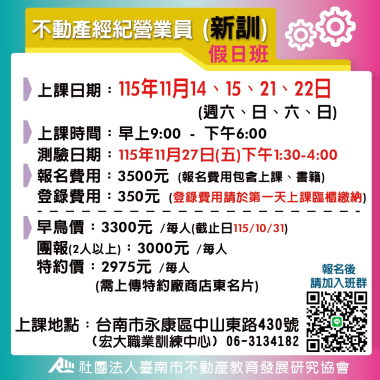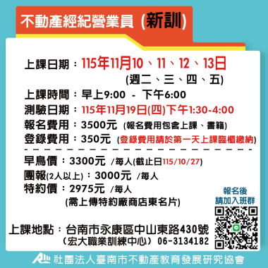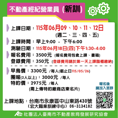不動產經紀營業員-新訓 (首次) 宏大職訓中心~不動營業員報名流程,請先閱覽! 課程介紹 我要報名 不動產經紀營業員-新訓 (首次) 不動產營業員(新訓)退費 注意事項說明 報名前,請詳細閱讀 課程介紹 我要報名 不動產經紀營業員-新訓 (首次) 115(上) 4/14-4/17不動產經紀營業員(新訓) **請詳讀【課程介紹】與【報名須知】** **報名後請務必加入班群** 課程介紹 我要報名 不動產經紀營業員-新訓 (首次) 115(上) 5/12- 5/15 不動產經紀營業員(新訓) **請詳讀【課程介紹】與【報名須知】** **報名後請務必加入班群** 課程介紹 我要報名 不動產經紀營業員-新訓 (首次) 115(上) 05/16、05/17、05/23、05/24 不動產經紀營業員 (新訓) 假日班 **請詳讀【課程介紹】與【報名須知】** **報名後請務必加入班群** 課程介紹 我要報名 不動產經紀營業員-新訓 (首次) 115(上) 6/9-6/12 不動產經紀營業員(新訓) **請詳讀【課程介紹】與【報名須知】** **報名後請務必加入班群** 課程介紹 我要報名 不動產經紀營業員-新訓 (首次) 115(下) 7/04-7/12 不動產經紀營業員(新訓) 假日班 **請詳讀【課程介紹】與【報名須知】** **報名後請務必加入班群** 課程介紹 我要報名 不動產經紀營業員-新訓 (首次) 115(下) 7/14-7/17 不動產經紀營業員(新訓) **請詳讀【課程介紹】與【報名須知】** **報名後請務必加入班群** 課程介紹 我要報名 不動產經紀營業員-新訓 (首次) 115(下) 8/11-8/14 不動產經紀營業員(新訓) **請詳讀【課程介紹】與【報名須知】** **報名後請務必加入班群** 課程介紹 我要報名 不動產經紀營業員-新訓 (首次) 115(下) 8/15-8/23 不動產經紀營業員(新訓) 假日班 **請詳讀【課程介紹】與【報名須知】** **報名後請務必加入班群** 課程介紹 我要報名 不動產經紀營業員-新訓 (首次) 115(下) 9/08-9/11 不動產經紀營業員(新訓) **請詳讀【課程介紹】與【報名須知】** **報名後請務必加入班群** 課程介紹 我要報名 不動產經紀營業員-新訓 (首次) 115(下) 10/13-10/15 不動產經紀營業員(新訓) **請詳讀【課程介紹】與【報名須知】** **報名後請務必加入班群** 課程介紹 我要報名 不動產經紀營業員-新訓 (首次) 115(下) 11/10-11/13 不動產經紀營業員(新訓) **請詳讀【課程介紹】與【報名須知】** **報名後請務必加入班群** 課程介紹 我要報名 不動產經紀營業員-新訓 (首次) 115(下) 11/14-11/22 不動產經紀營業員(新訓) 假日班 **請詳讀【課程介紹】與【報名須知】** **報名後請務必加入班群** 課程介紹 我要報名 不動產經紀營業員-新訓 (首次) 115(下) 12/8-12/11 不動產經紀營業員(新訓) **請詳讀【課程介紹】與【報名須知】** **報名後請務必加入班群** 課程介紹 我要報名