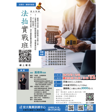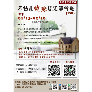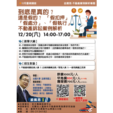 不動產類 12/13 土地坪效與坪效係數 課程介紹 我要報名 不動產類 115/01/13-不動產特殊規定解析班 【不動產實務課程】【專業講師】 課程介紹 我要報名 不動產類 12/20 不動產案例解析專題 到底是真的?還是假的? 「假扣押」、「假處分」、「假執行」不動產訴訟案例解析 課程介紹 我要報名 不動產類 12/14 不動產案例解析專題講座11-漏水瑕疵全攻略 房仲最常見的瑕疵爭議 課程介紹 我要報名 不動產類 115/1/17、1/24 法拍實戰班 課程介紹 我要報名 不動產類 1216 房東租賃管理經營實務班 課程介紹 我要報名