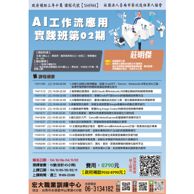 產業人才投資計畫課程總表 114年度下半年產業人才投資計畫之課程總覽 政府補助 三年十萬 課程介紹 我要報名 人力資源與管理 【164809】114/10/14 ESG與碳盤查查證人員訓練班第01期 政府補助 三年十萬 課程介紹 我要報名 電腦數位科技 【165105】114/10/07 AI品牌視覺設計與應用實務班第01期 政府補助 三年十萬 課程介紹 我要報名 電腦數位科技 【165204】114/10/20 AI影音創作入門班第01期 政府補助 三年十萬 課程介紹 我要報名 職場語言 【165060】114/10/20 手語多元技能基礎班第01期 政府補助 三年十萬 課程介紹 我要報名 健康運動管理 【164995】114/10/28 樂齡運動指導員培力實務班第03期 政府補助 三年十萬 課程介紹 我要報名 人力資源與管理 【164810】114/11/2 ESG與產品碳足跡查證人員訓練班第01期 政府補助 三年十萬 課程介紹 我要報名 不動產實務 【165220】114/11/3 非都市土地變更使用實務解析班第01期 政府補助 三年十萬 課程介紹 我要報名 電腦數位科技 【164944】114/11/05 AI工作流應用實踐班第02期 政府補助 三年十萬 課程介紹 我要報名 電腦數位科技 114/11/12 AI短影片行銷班第01期 政府補助 三年十萬 課程介紹 我要報名 觀光休閒旅遊 【165183】114/11/11 觀光導遊領隊人員實務班第02期 政府補助 三年十萬 課程介紹 我要報名 不動產證照補助 114(下)年度 地政士考照班 政府補助 三年十萬 【按下課程介紹】 依照各科的報名區間,連結至台灣就業通報名,謝謝!! 課程介紹 我要報名 健康運動管理 【165064】114/11/27 樂齡活力律動帶領培訓班第03期 政府補助 三年十萬 課程介紹 我要報名 人力資源與管理 【164811】114/11/30 企業永續報告書撰寫實務班第01期 政府補助 三年十萬 課程介紹 我要報名 人力資源與管理 【164812】114/12/04 碳中和實務班第01期 政府補助 三年十萬 課程介紹 我要報名 人力資源與管理 【164945】114/12/05 就業服務人力仲介及管理班第01期 政府補助 三年十萬 課程介紹 我要報名 觀光休閒旅遊 【164998】114/12/06 觀光導遊領隊人員實務班第02期 政府補助 三年十萬 課程介紹 我要報名 不動產實務 【165222】114/12/11 共有土地紛爭實例處理解析班第01期 政府補助 三年十萬 課程介紹 我要報名 人力資源與管理 【164813】114/12/21 淨零碳規劃管理人員培訓實務班第01期 政府補助 三年十萬 課程介紹 我要報名