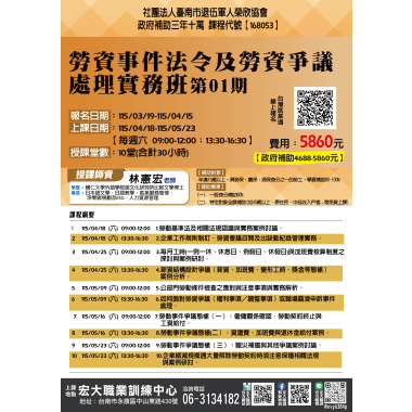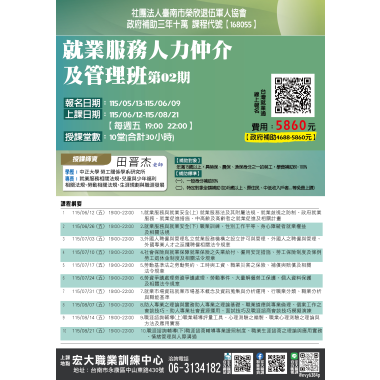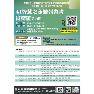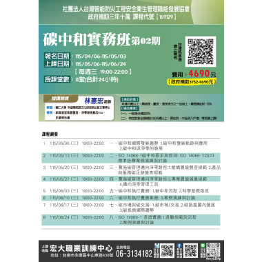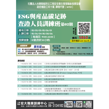 人力資源與管理 【168197】115/3/20-115/6/5 就業服務人力仲介管理班第02期 政府補助 三年十萬 課程介紹 我要報名 人力資源與管理 【169128】115/3/24-115/6/9 ESG與碳盤查查證人員訓練班第02期 政府補助 三年十萬 課程介紹 我要報名 人力資源與管理 【168053】115/04/18-115/05/2勞資事件法令及勞資爭議處理實務班第01期 政府補助 三年十萬 課程介紹 我要報名 人力資源與管理 【169129】115/05/06-115/06/24碳中和實務班第02期 政府補助 三年十萬 課程介紹 我要報名 人力資源與管理 【169130】115/05/16-115/06/13AI智慧之永續報告書實務班第01期 政府補助 三年十萬 課程介紹 我要報名 人力資源與管理 【169131】115/06/04-115/08/06ESG與產品碳足跡查證人員訓練班第02期 政府補助 三年十萬 課程介紹 我要報名 人力資源與管理 【168055】115/06/12-115/08/21就業服務人力仲介及管理班第02期 政府補助 三年十萬 課程介紹 我要報名