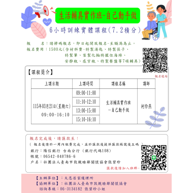 115/3/21 生活輔具實作班-自己動手做 6H (7.2積分)