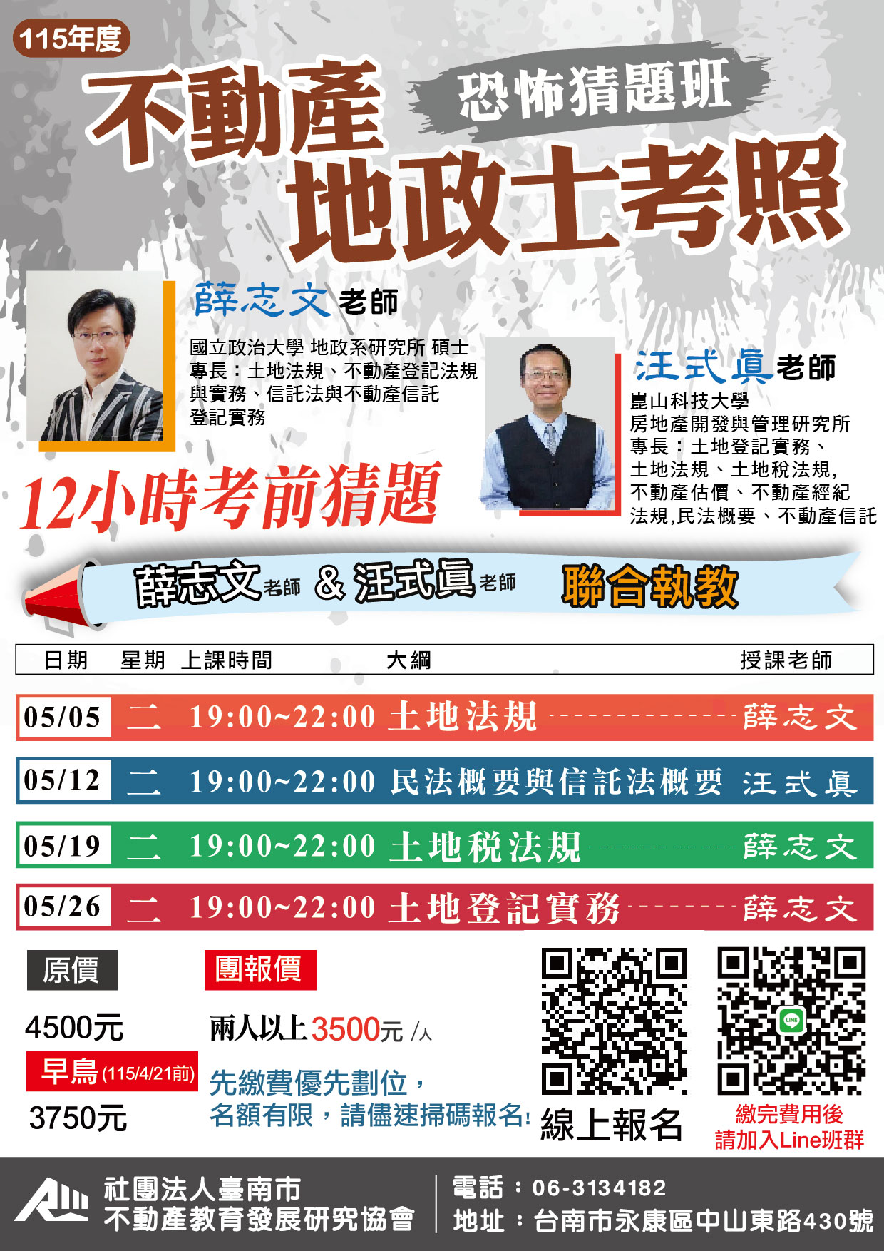 115年 0505、0512、0519、0526 地政士考照恐怖猜題班