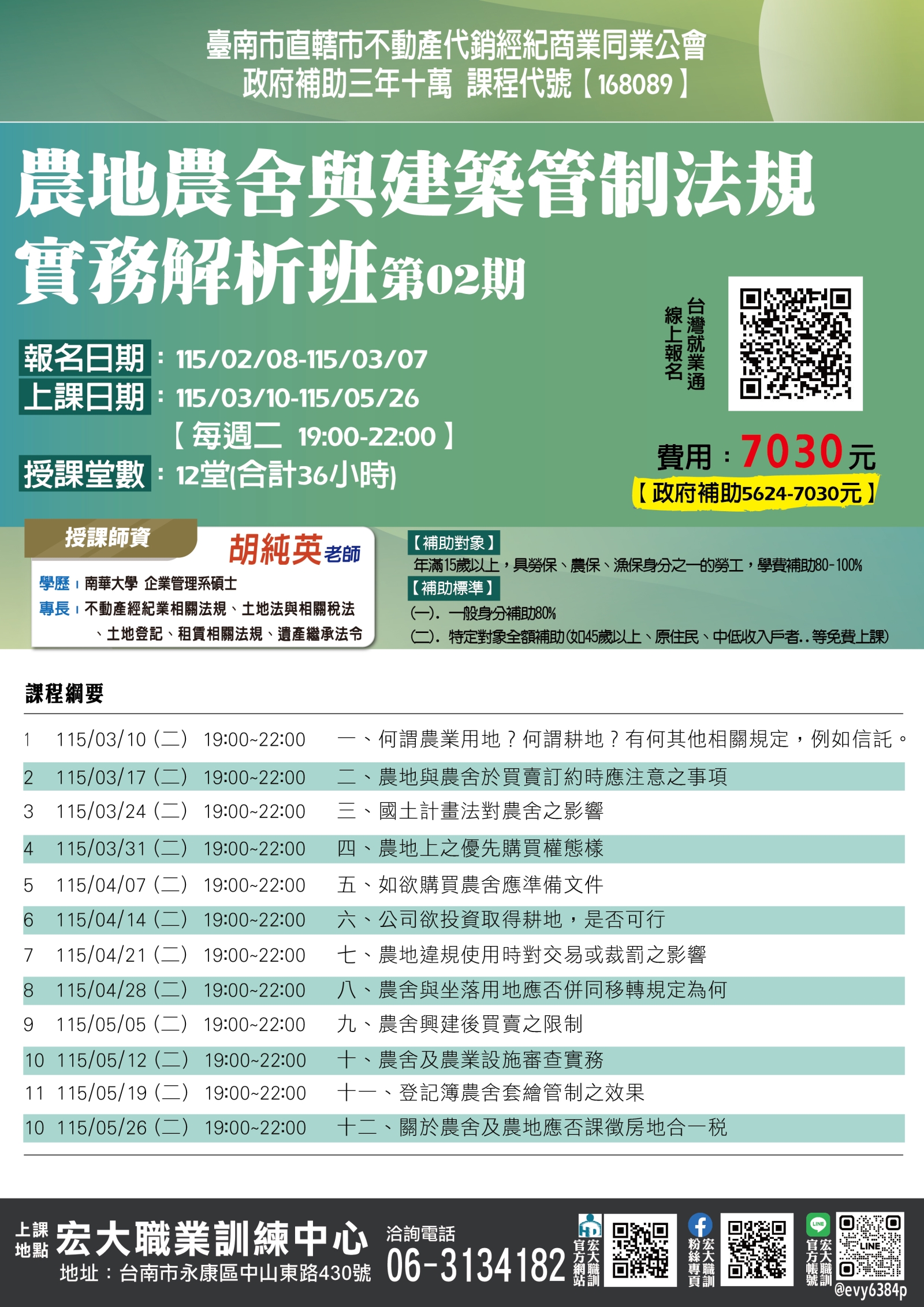 【168089】115/03/10-05/26農地農舍與建築管制法規實務解析班第02期